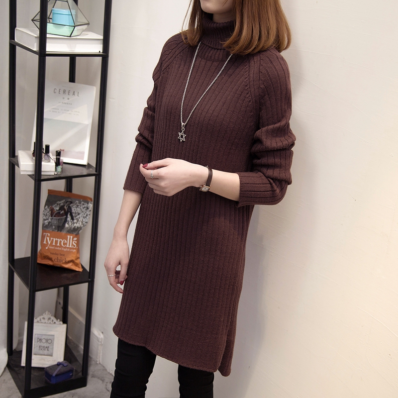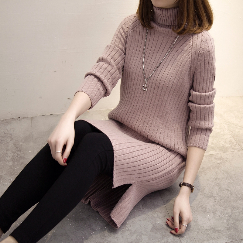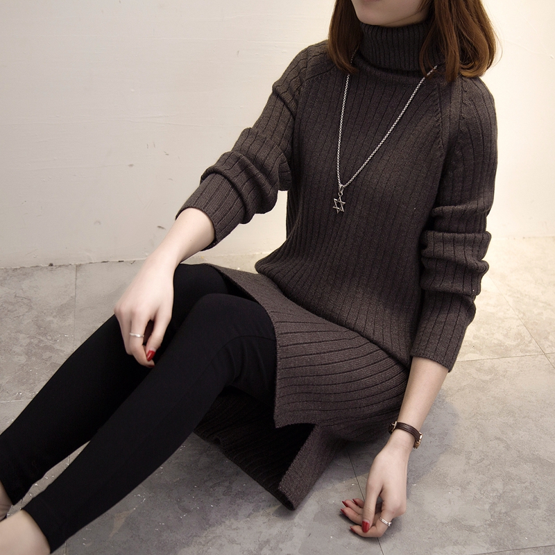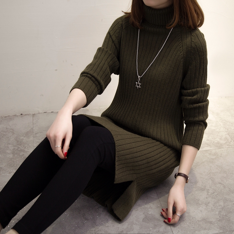 / 高領針織衫毛衣女秋冬女裝中長款韓版純色套頭外套開叉新款潮