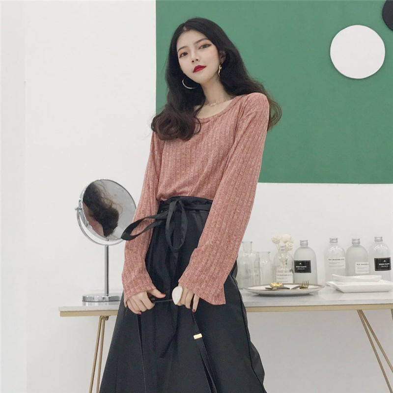 韓版女裝百搭修身顯瘦開叉長袖T恤純色防曬罩衫2018秋裝新款上衣