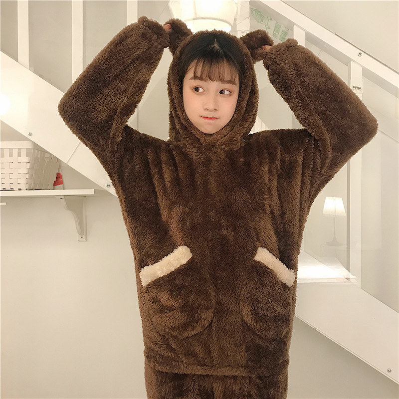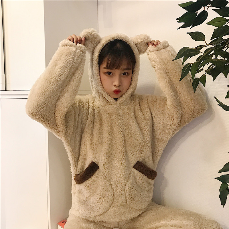 / 秋冬韓版甜美可愛家居服套裝毛絨連帽套頭睡衣+睡褲長褲兩件套女