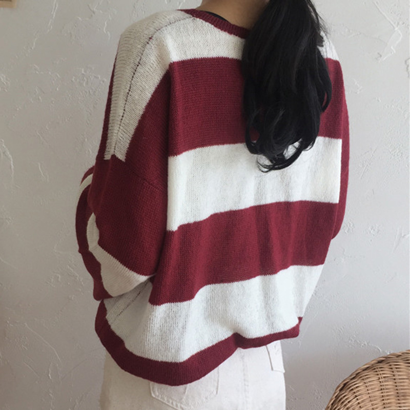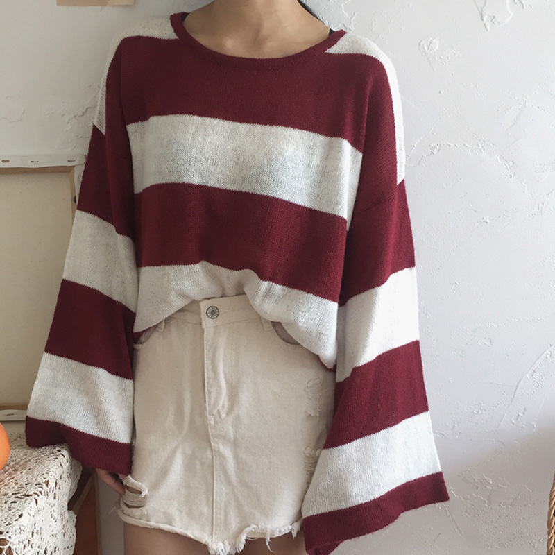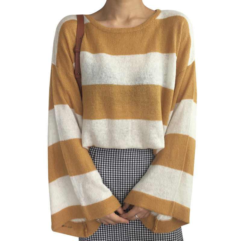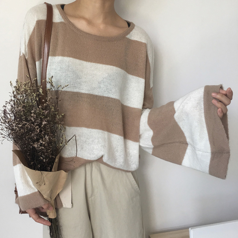 港味復古毛衣女2018新款條紋撞色寬松圓領針織衫顯瘦喇叭袖薄上衣