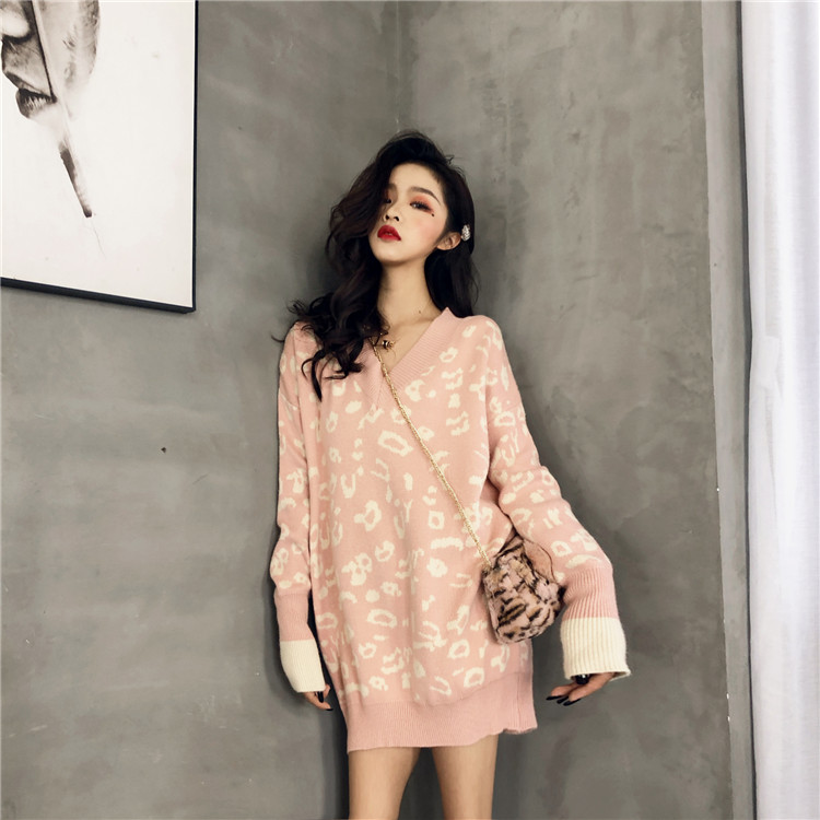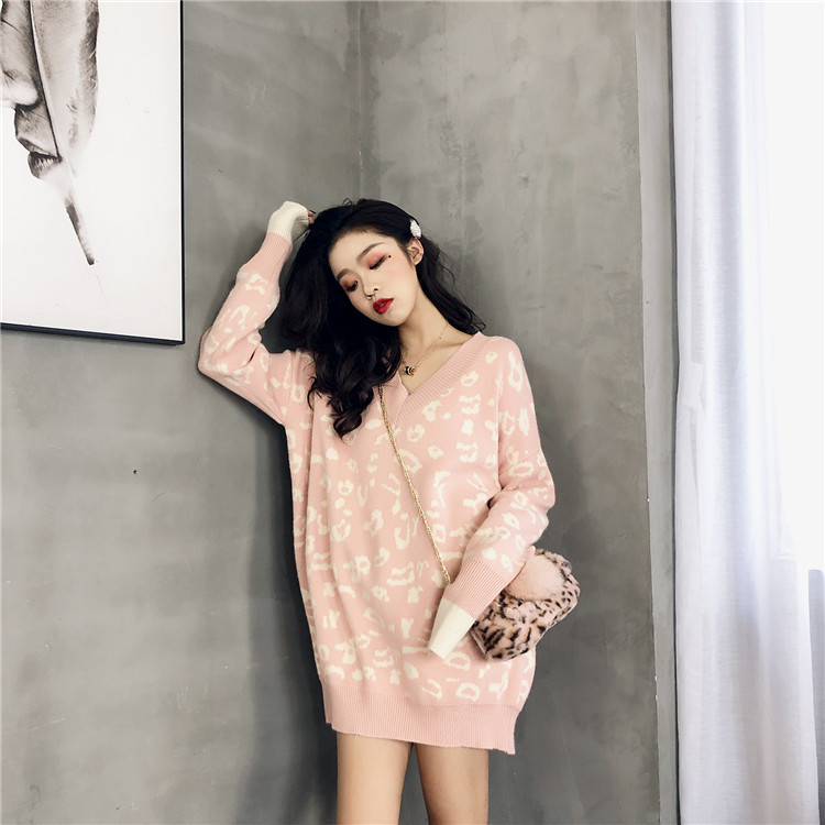 毛衣女2018新款豹紋套頭針織衫慵懶風寬松oversize中長款毛衣女潮