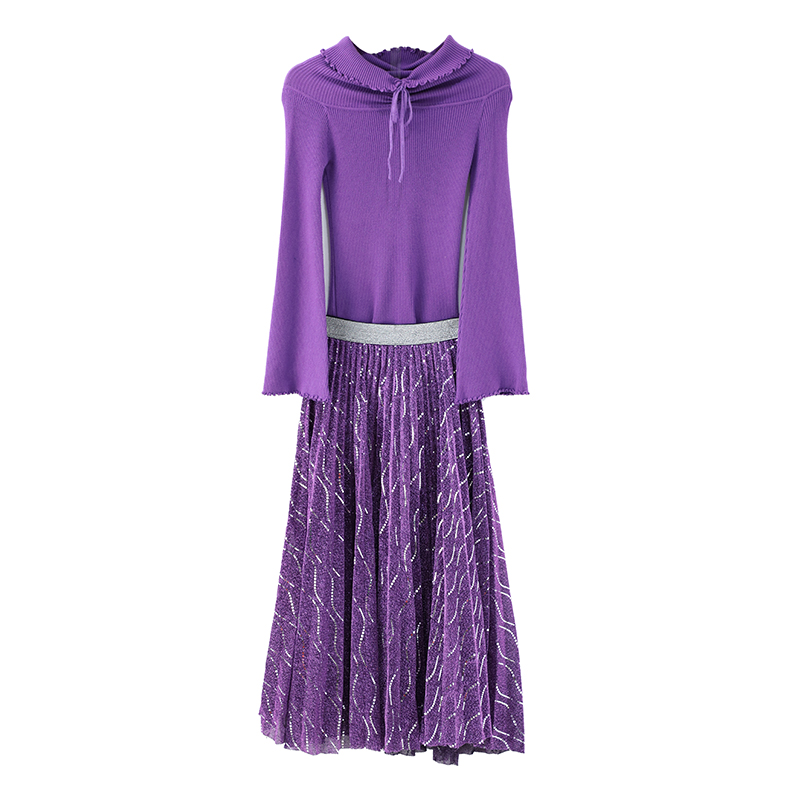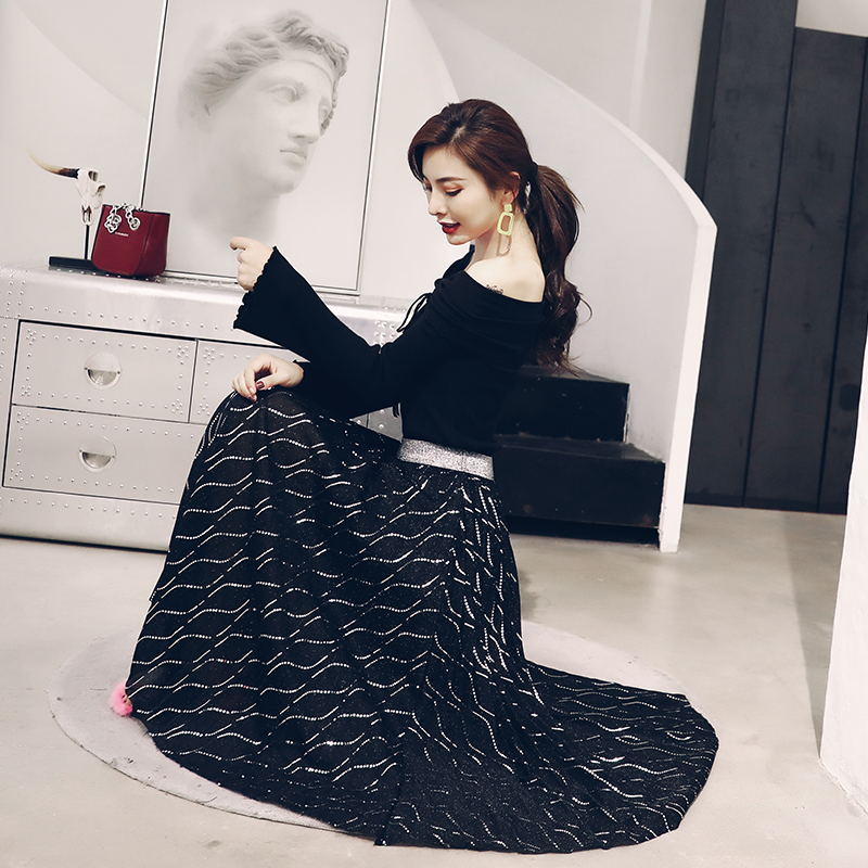 / 名媛氣質一字肩純色修身針織上衣網紗半身裙女2018早秋新款套裝潮