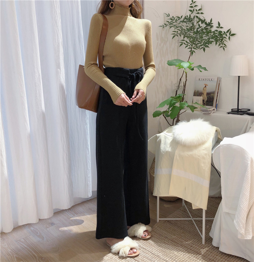/ 晚晚風同款系腰帶針織學生百搭長褲秋冬高腰顯瘦寬松休閑闊腿褲女