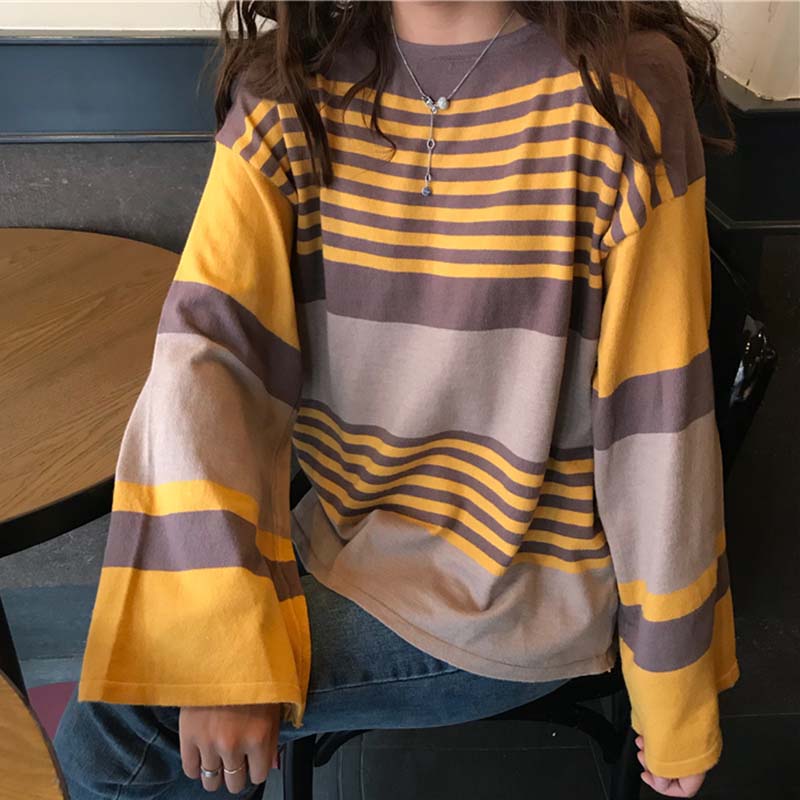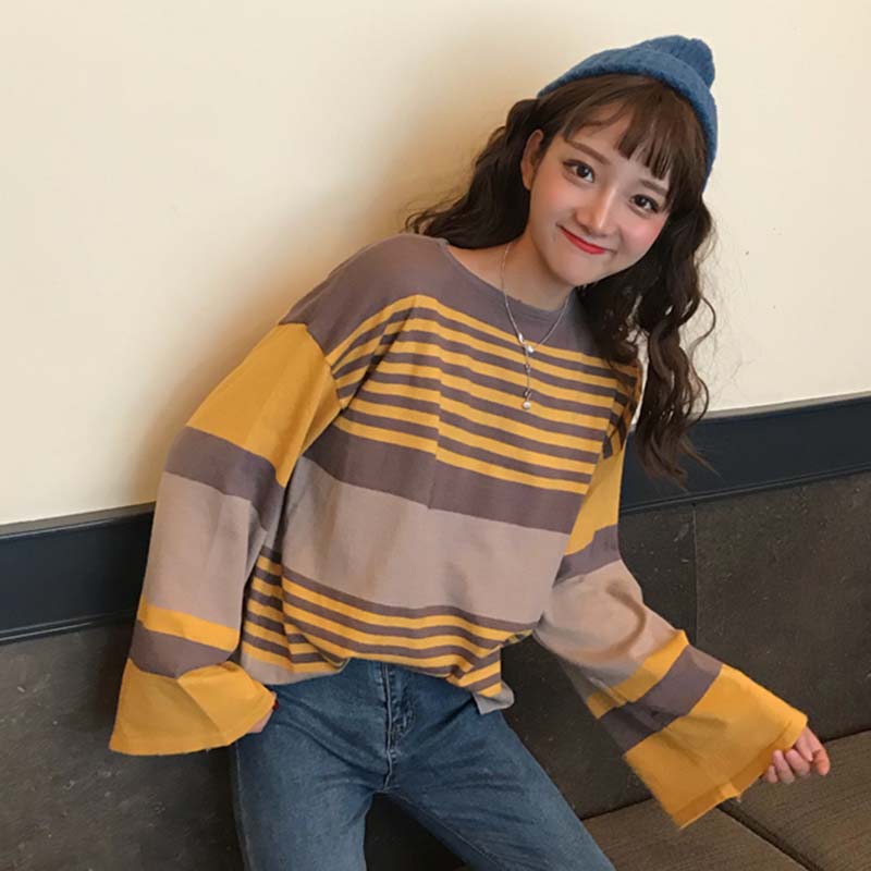 / 時尚拼色條紋慵懶毛衣秋裝女2018新款圓領套頭針織衫休閑長袖上衣