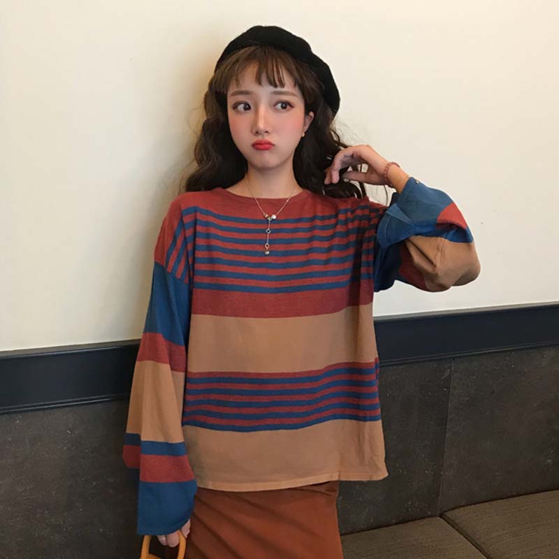 時尚拼色條紋慵懶毛衣秋裝女2018新款圓領套頭針織衫休閑長袖上衣
