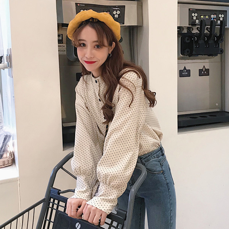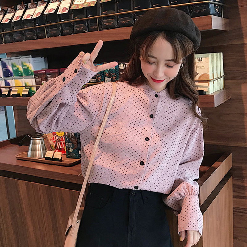 襯衫女秋冬裝2018新款韓版波點燈籠長袖上衣學生顯瘦中長打底開衫