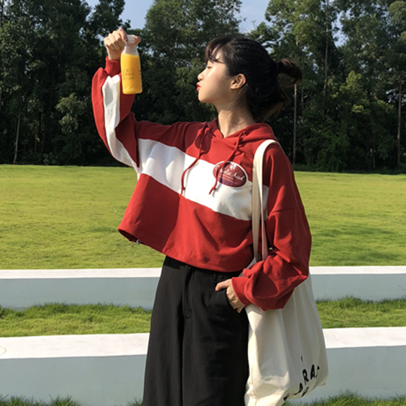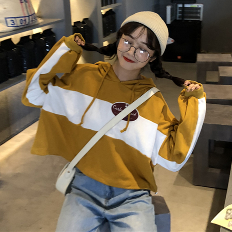 / 秋季新款女裝韓版拼色卡通印花休閑短款連帽衛衣學生寬松長袖上衣