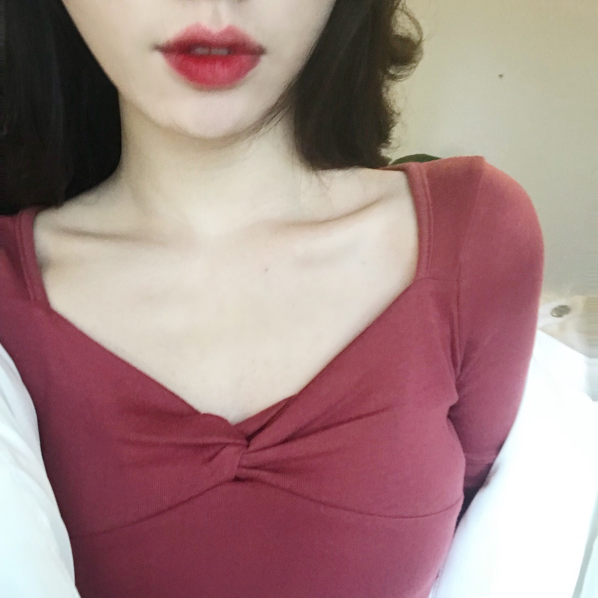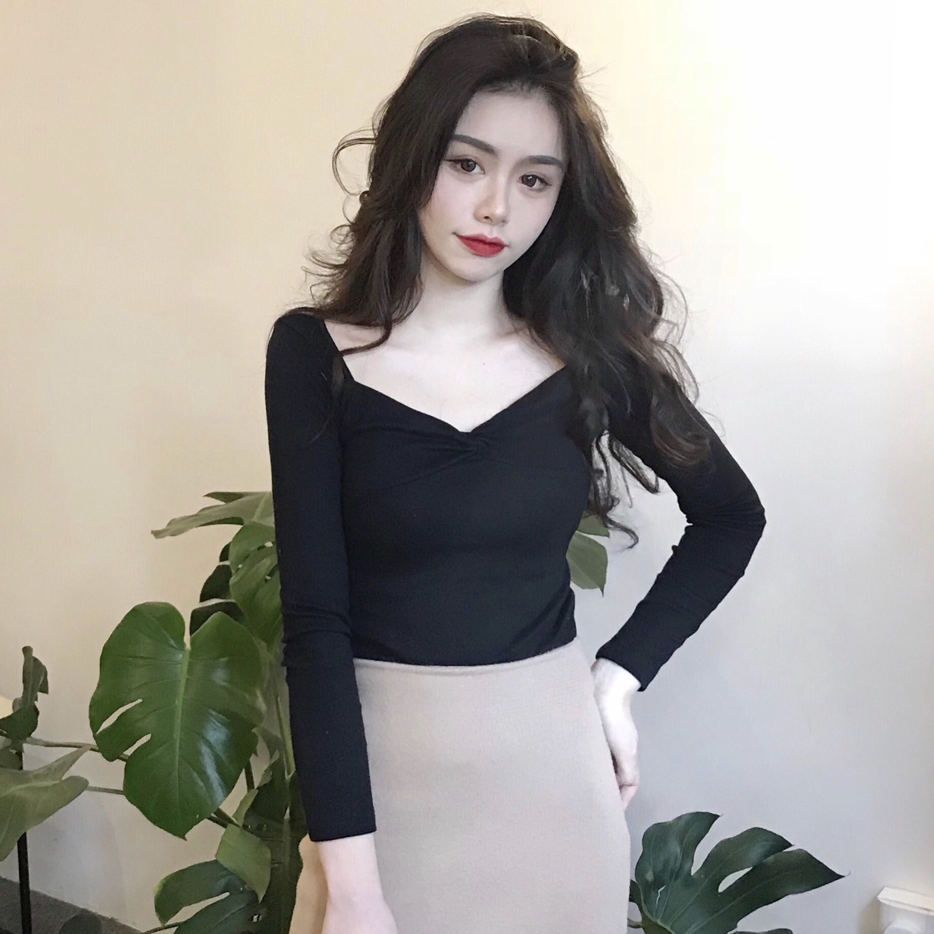時尚復古韓風秋裝女2018新款V領方領打底衫胸前打結顯白上衣女T恤