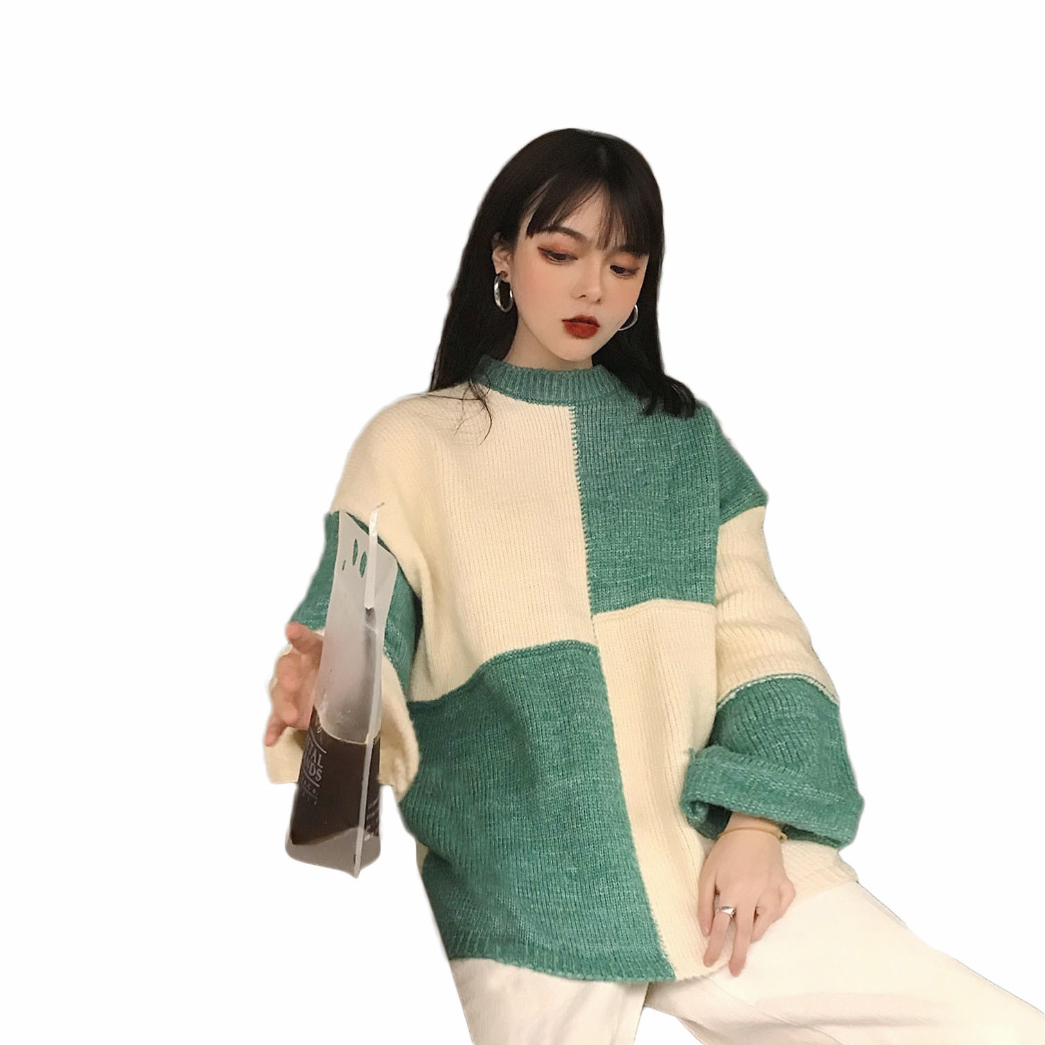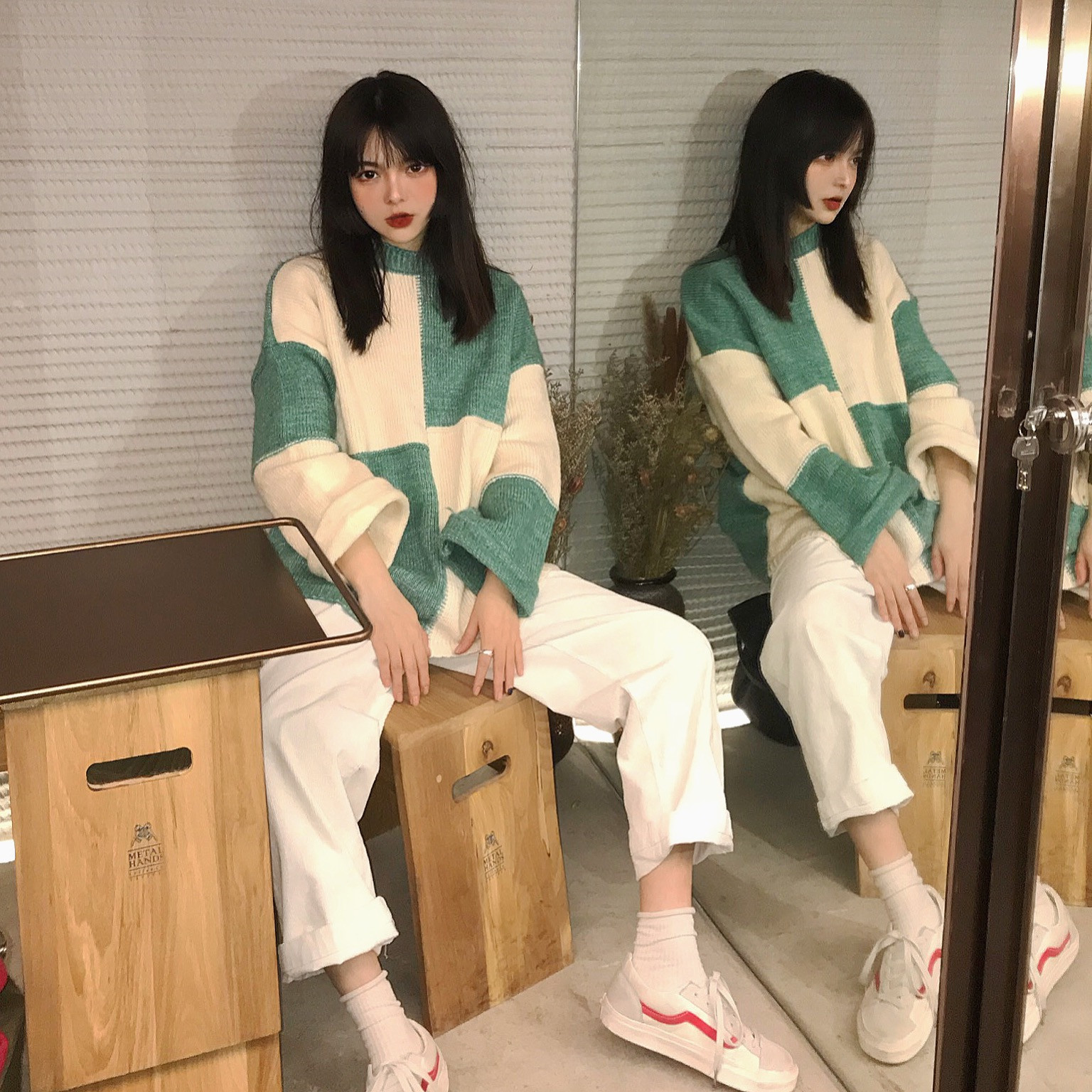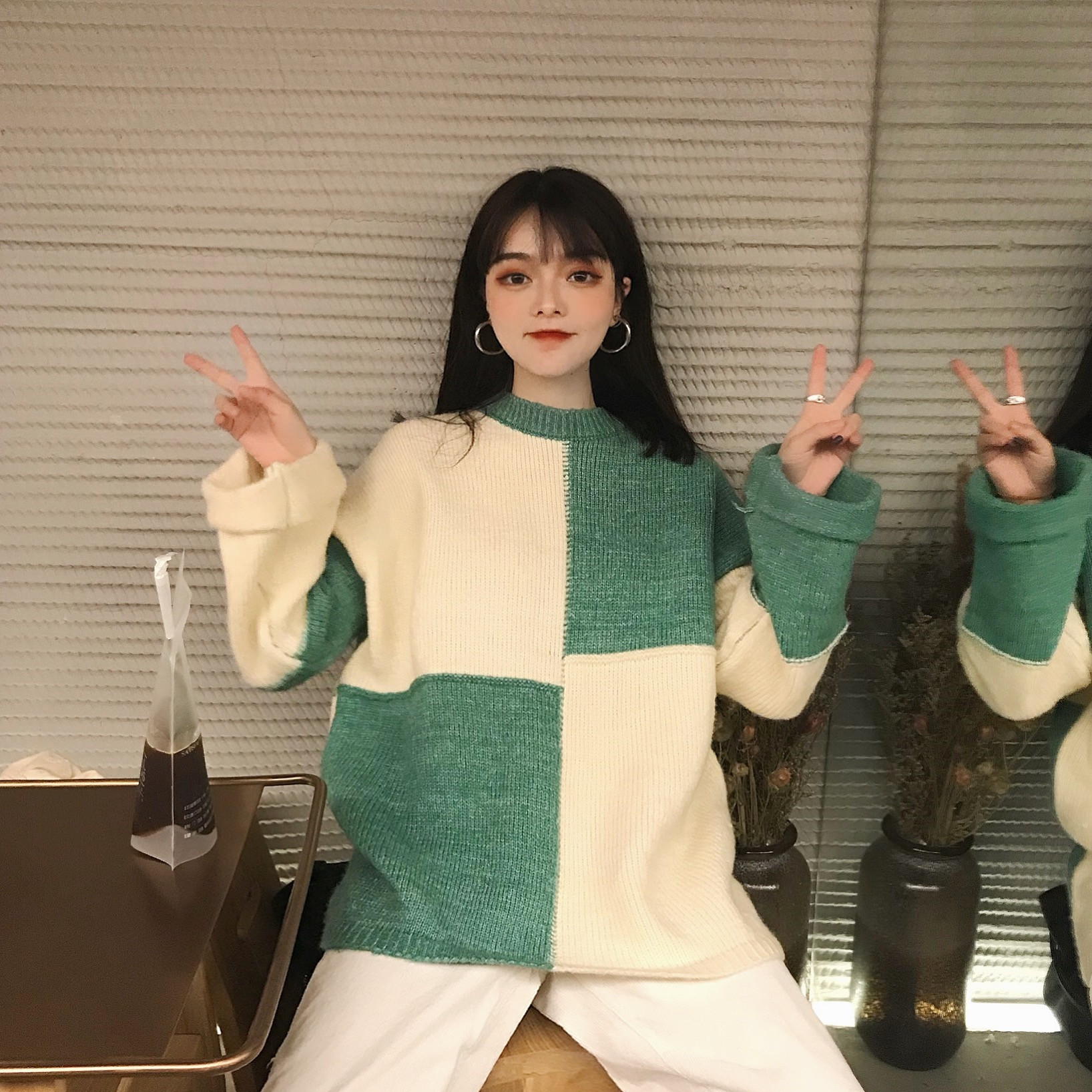 / 網紅同款2018新款秋冬寬松慵懶風套頭毛衣女甜美撞色加厚針織衫潮