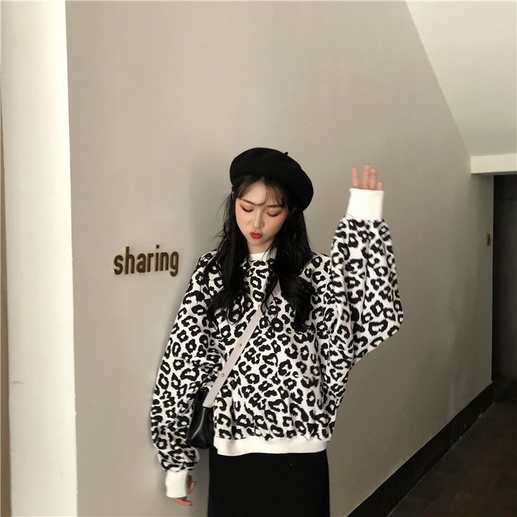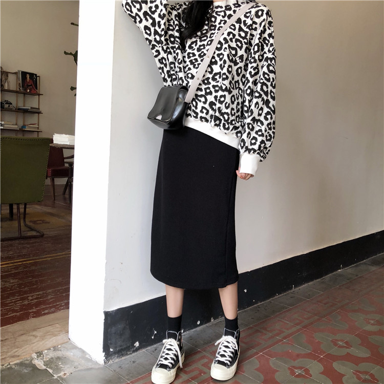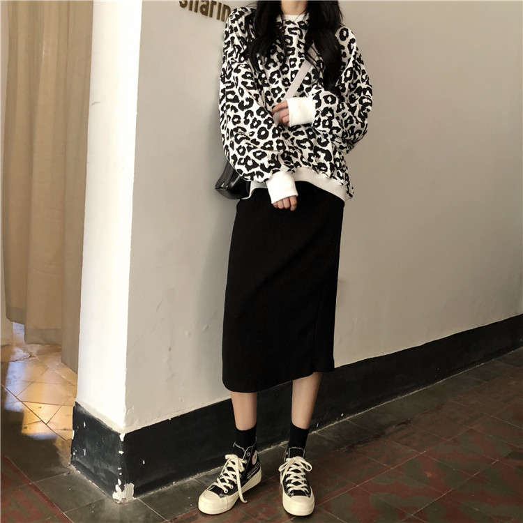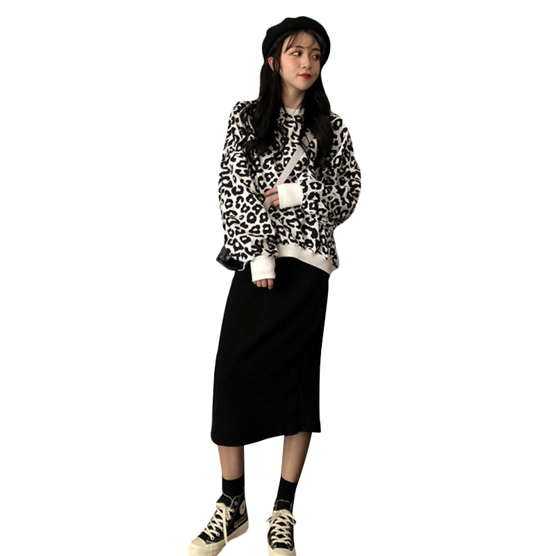 / 韓版時尚休閑套裝秋季港風豹紋衛衣外套+高腰針織半身裙兩件套女