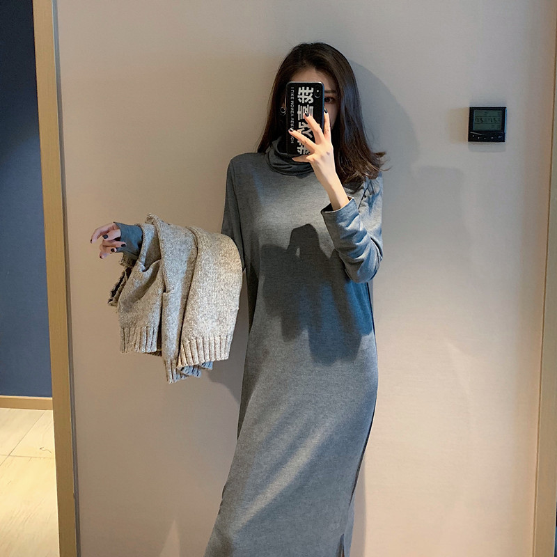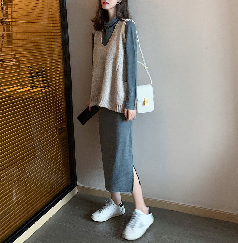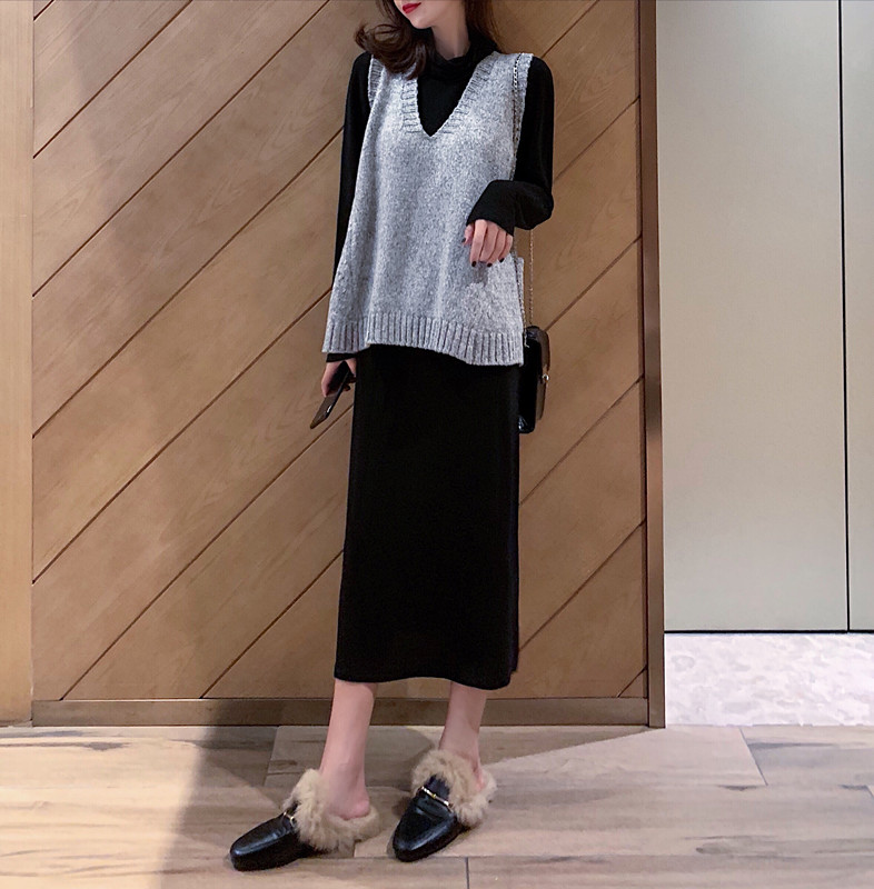 韓版秋裝女2018新款套裝V領針織馬甲女+慵懶打底高領連衣裙兩件套