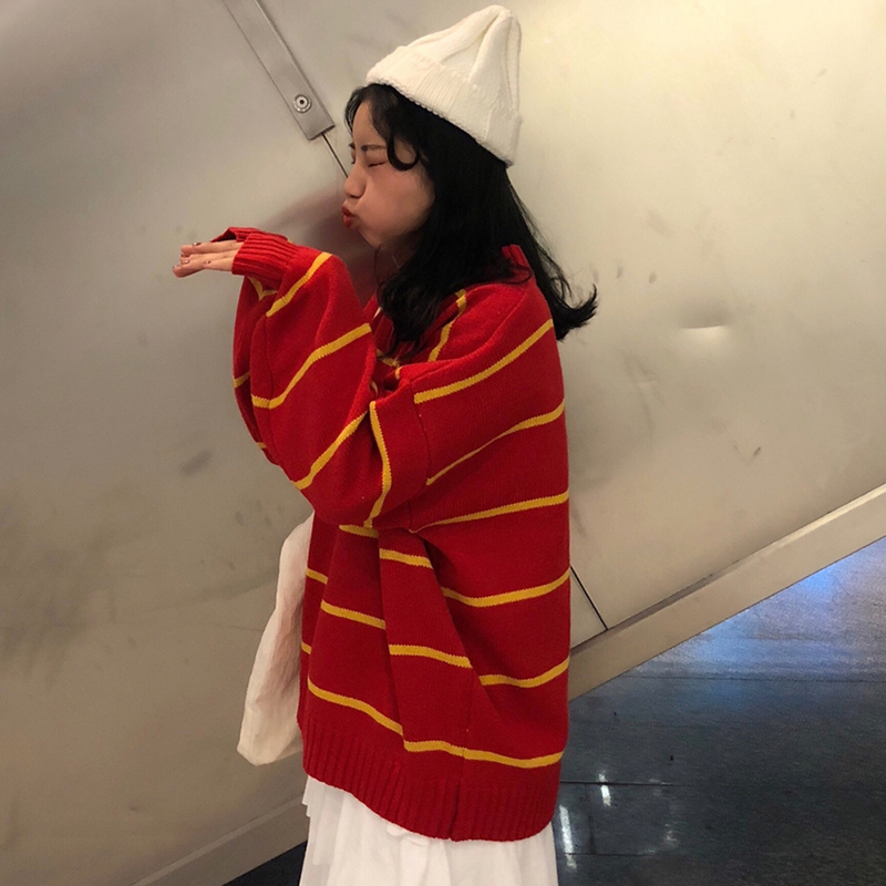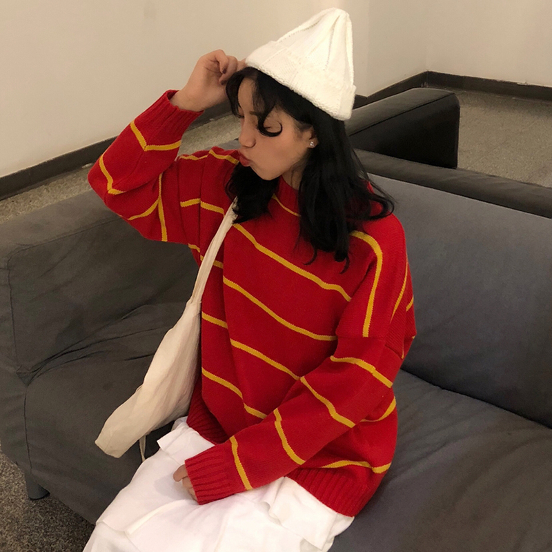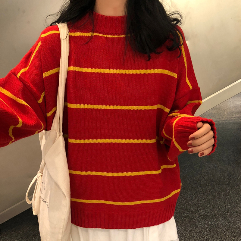 時尚條紋毛衣女秋冬裝2018新款圓領寬松針織外套學生長袖慵懶上衣