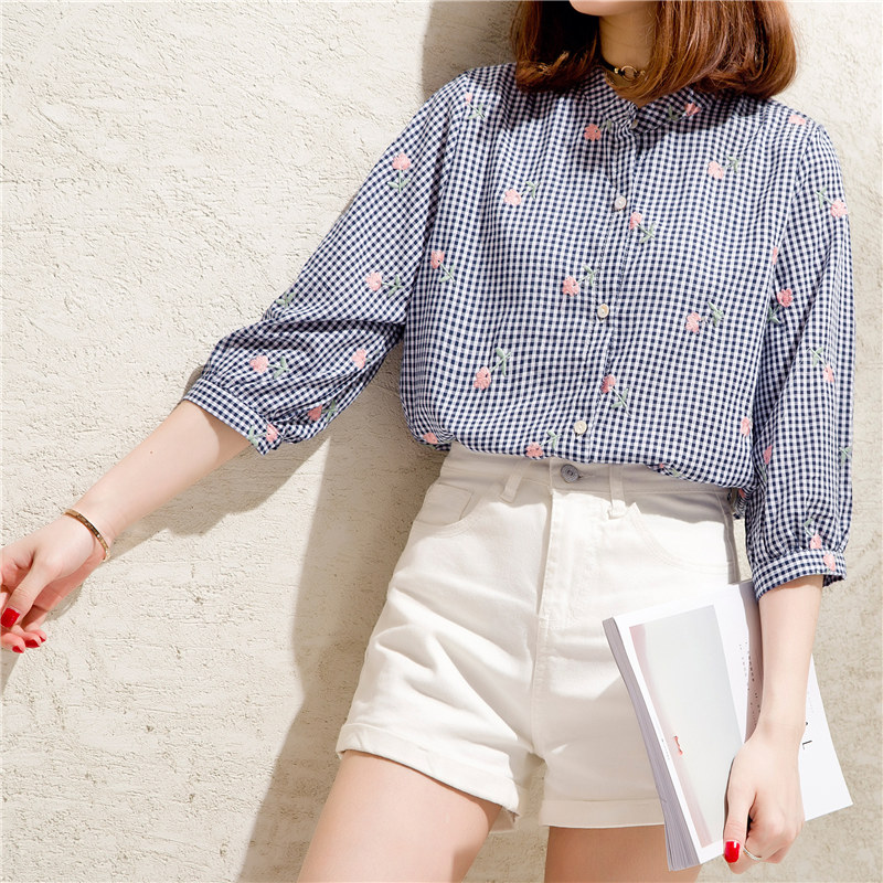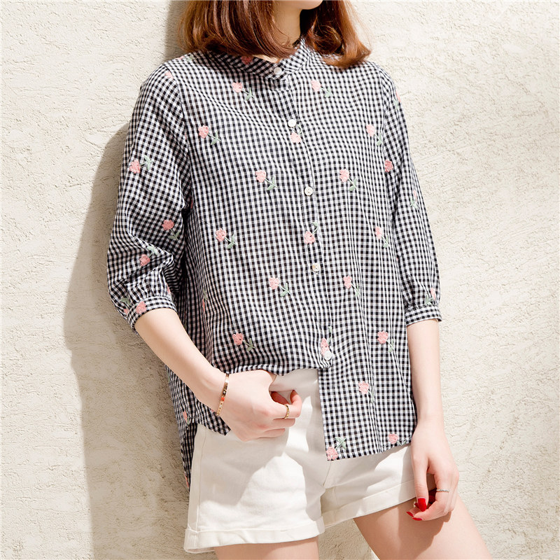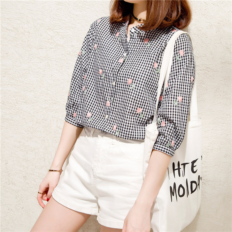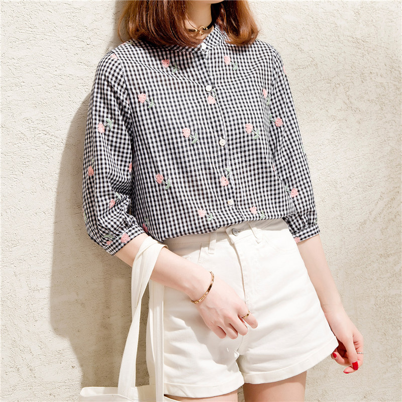 / 小清新格子條紋襯衫女chic襯衫外套韓范白襯衣女夏裝新款女裝