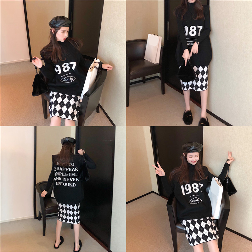 寬松懶惰風毛衣字母v領上衣菱格子高腰半身裙復古chic時尚套裝女
