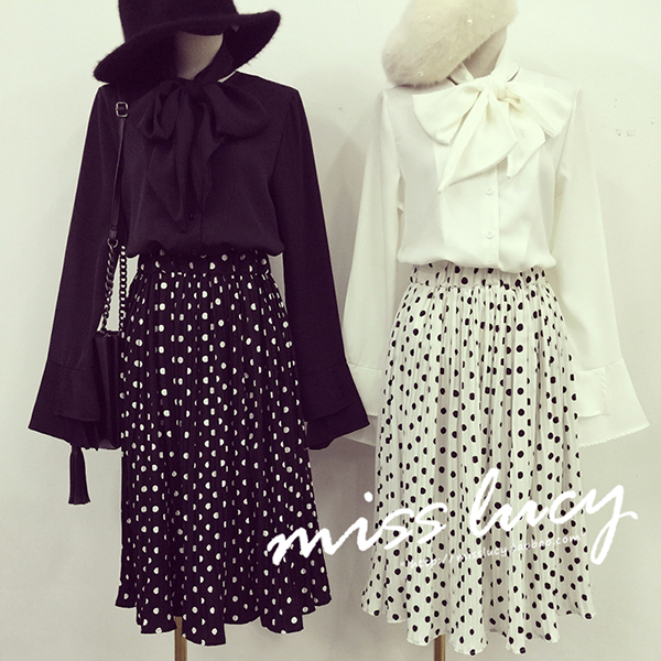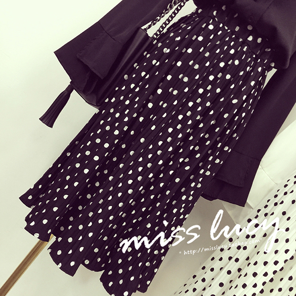 / 2017春裝新款女裝復古文藝波點高腰百搭松緊腰百褶裙半身裙中長裙