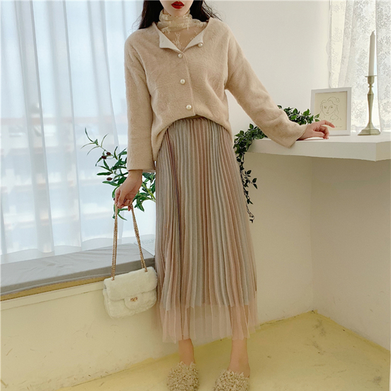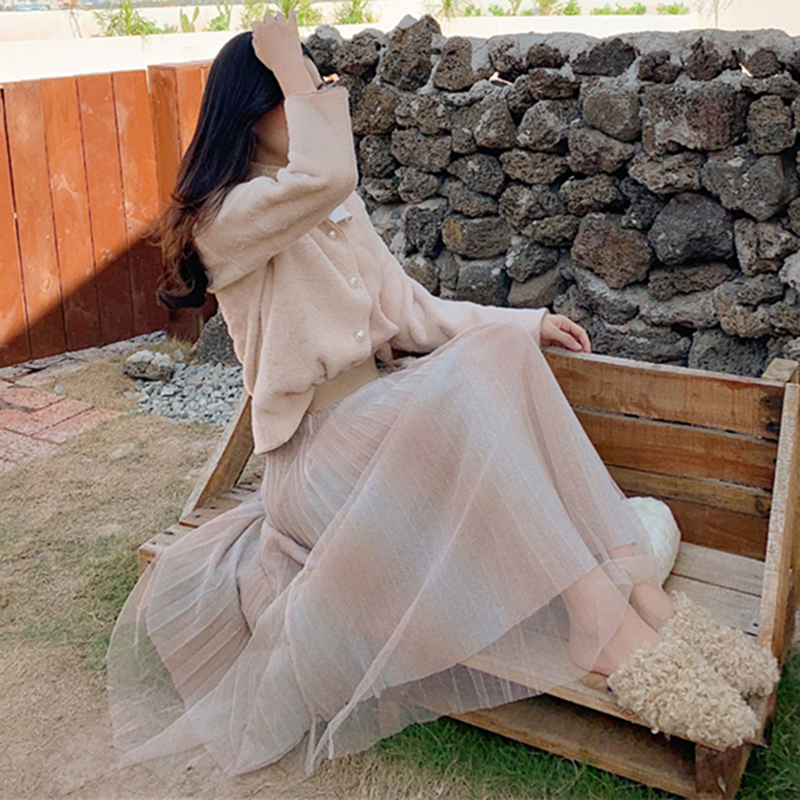 / 御姐套裝女秋冬新款長袖寬松開衫網紗打底衫高腰顯瘦A字半身裙子