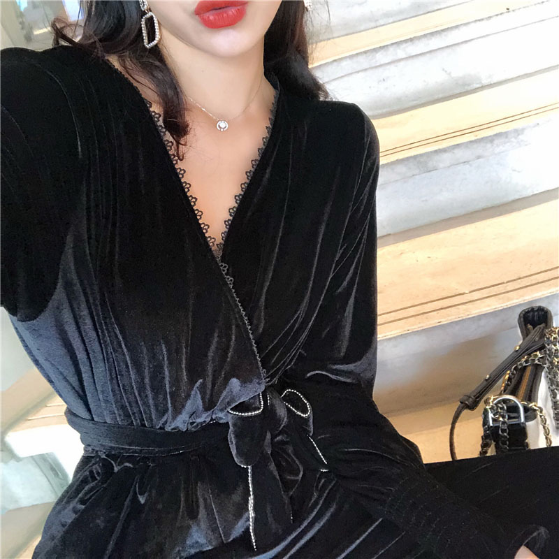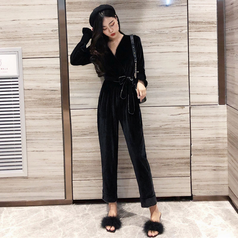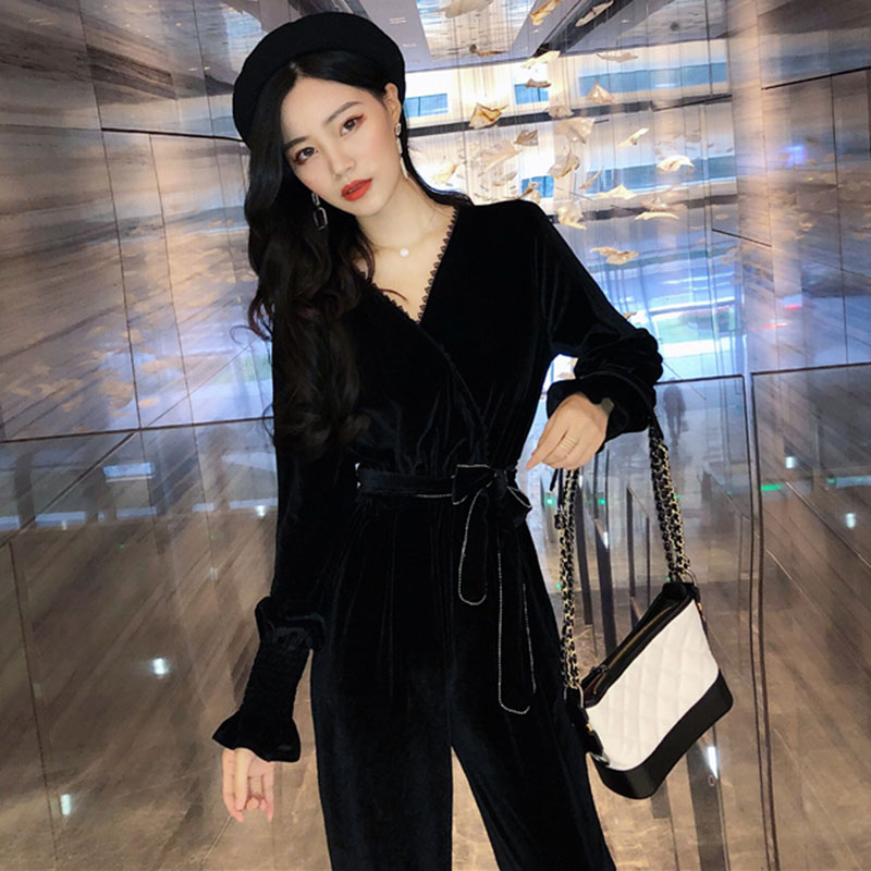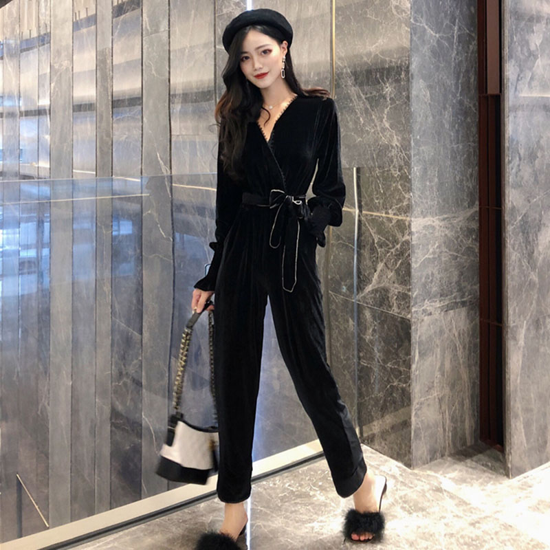 / 時尚絲絨收腰顯瘦連體褲女秋裝新款氣質V領寬松長袖黑色連衣褲子