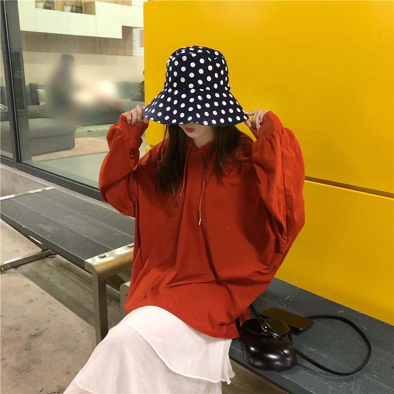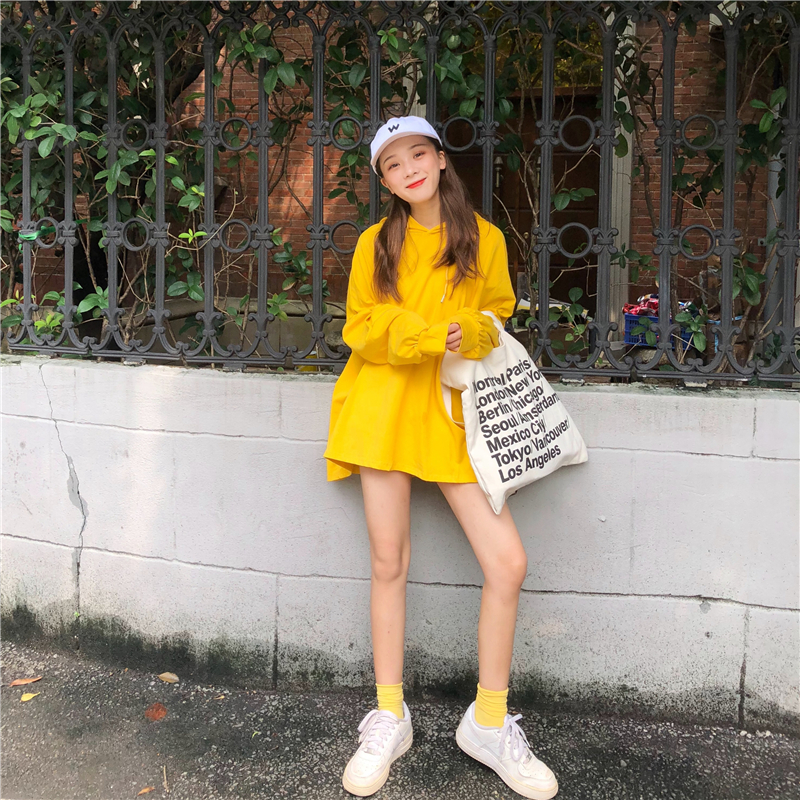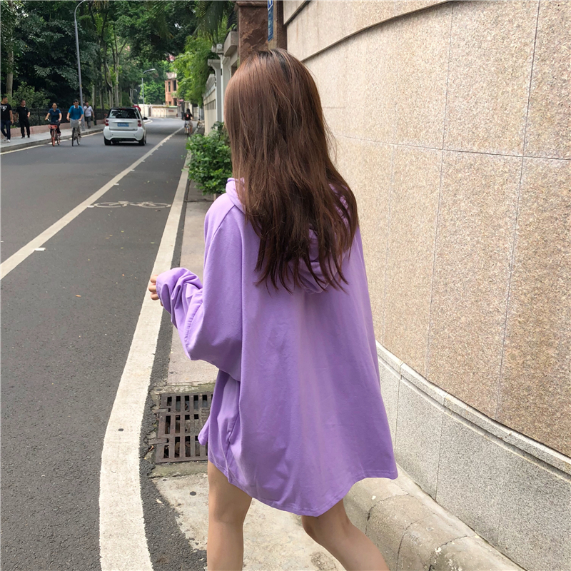 / 秋季女裝韓版慵懶風純色薄款連帽套頭衛衣中長款寬松長袖上衣外套
