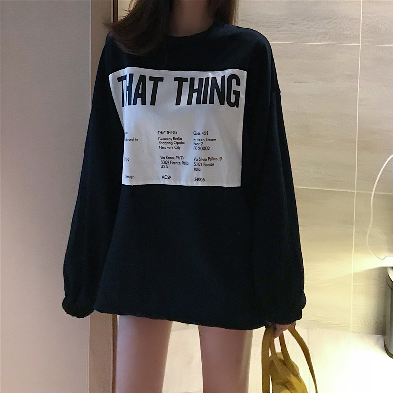 復古港風時尚氣質chic早秋上衣慵懶寬松百搭圓領貼布印花套頭衛衣