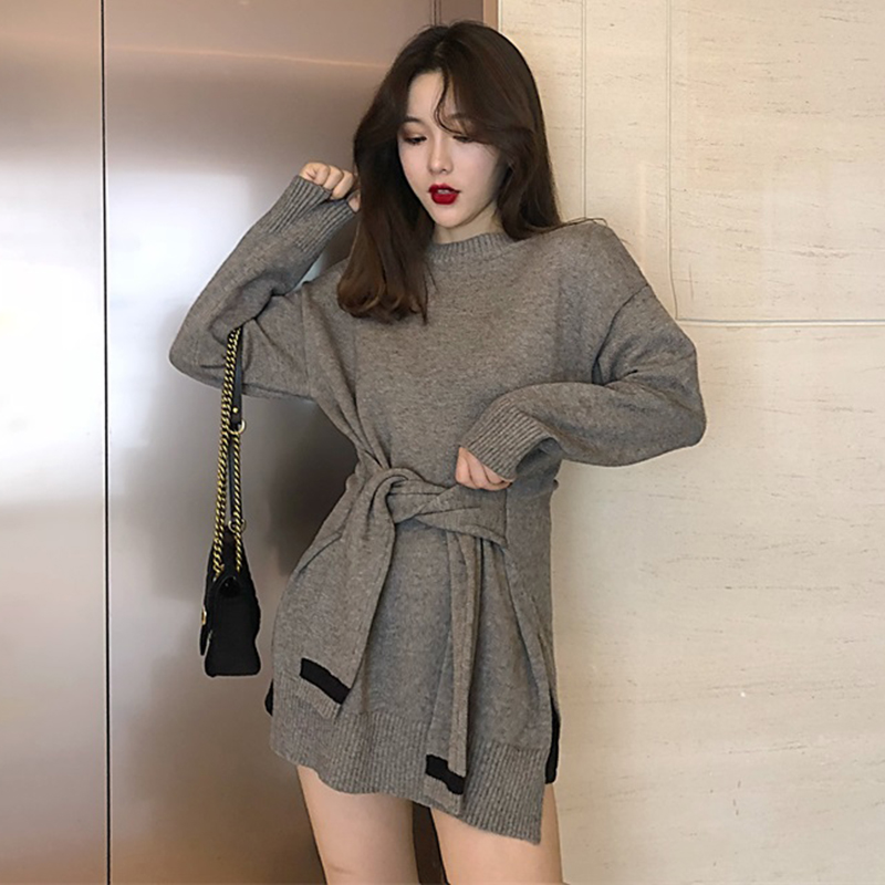 假兩件撞色長袖套頭針織外套女秋冬裝2018新款時尚氣質開叉毛衣裙