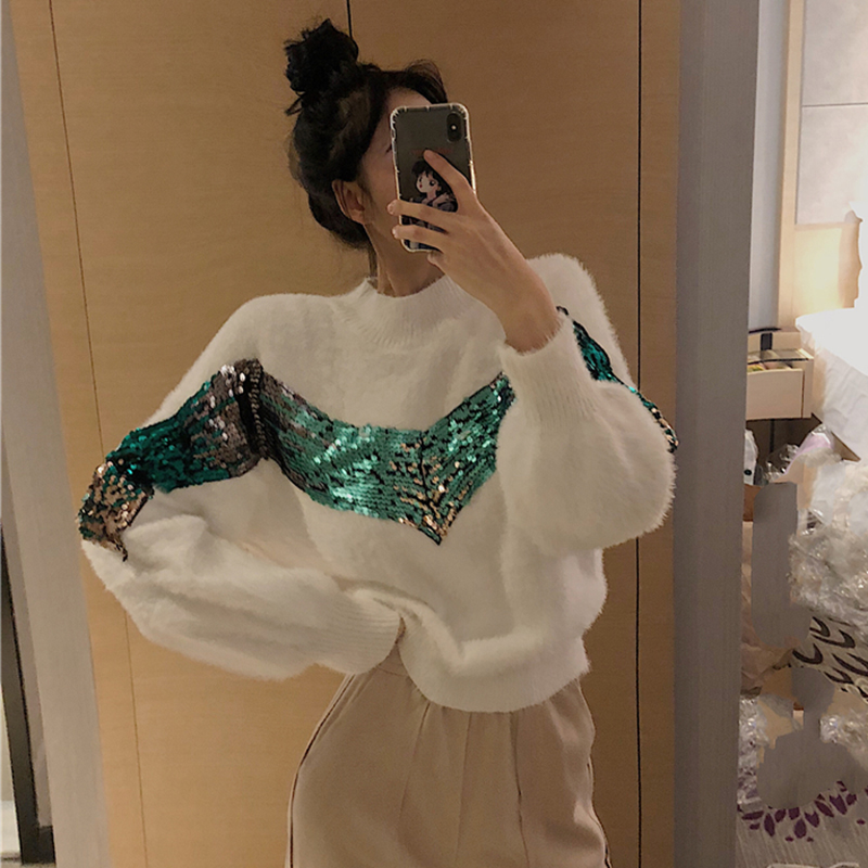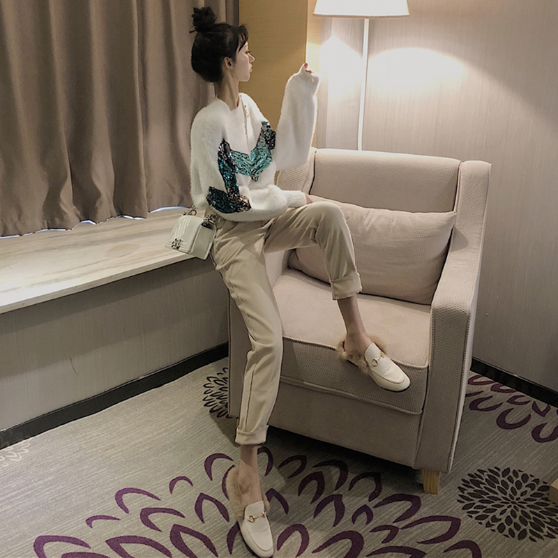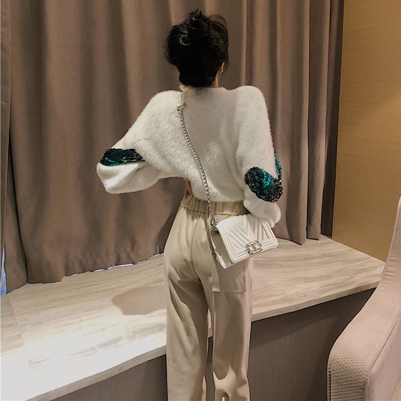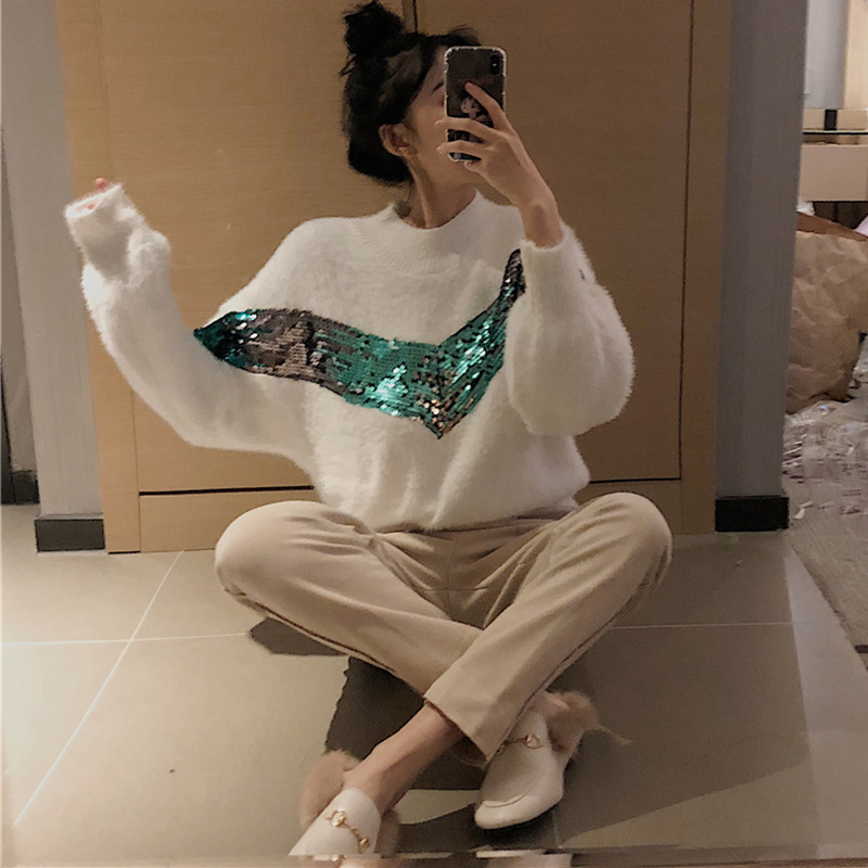 / 御姐套裝女秋冬新款亮片慵懶毛衣針織外套高腰顯瘦呢子休閑九分褲