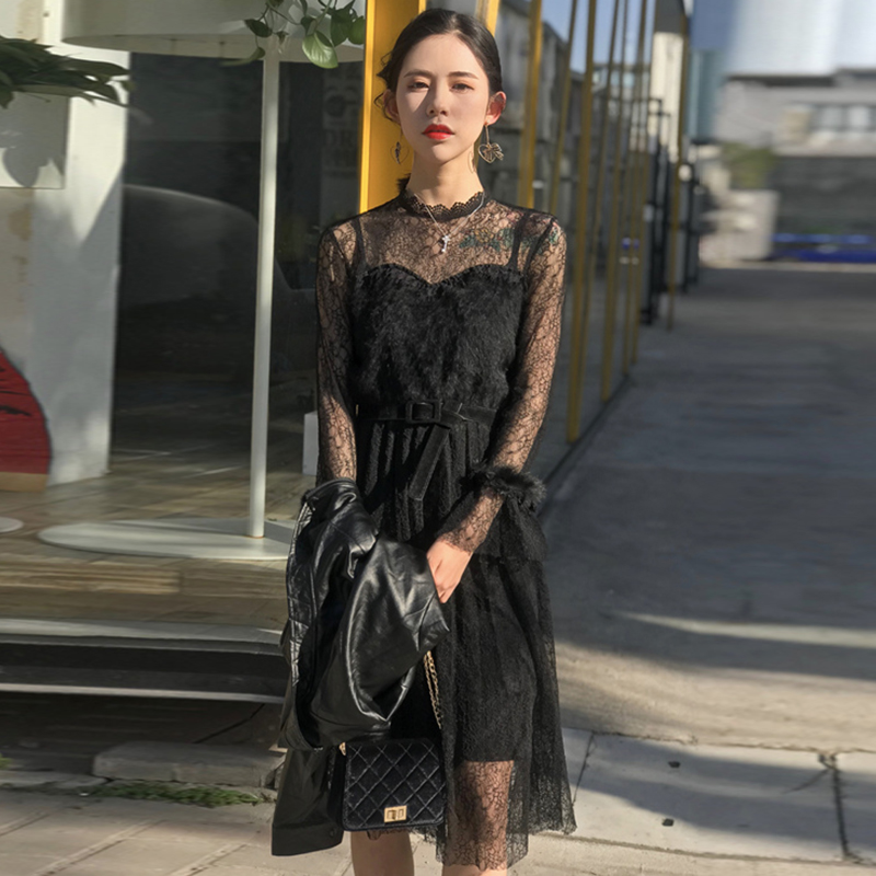 / 喇叭長袖收腰顯瘦連衣裙子女秋冬裝新款中長款蕾絲法式復古桔梗裙