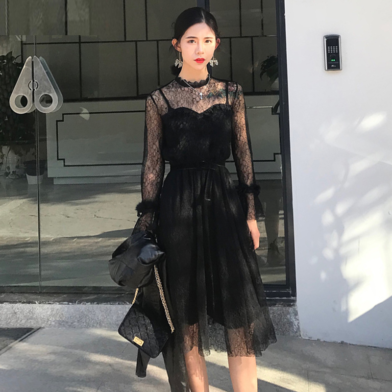 喇叭長袖收腰顯瘦連衣裙子女秋冬裝新款中長款蕾絲法式復古桔梗裙