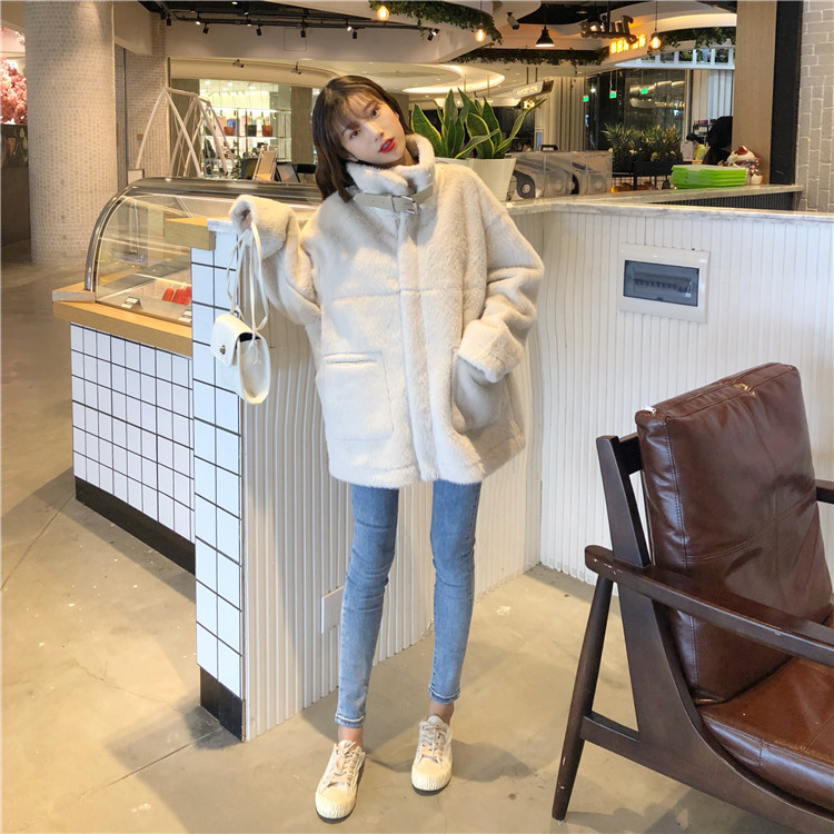 韓版新款秋冬時尚百搭長袖復古寬松高領中長款毛絨加厚保暖外套女