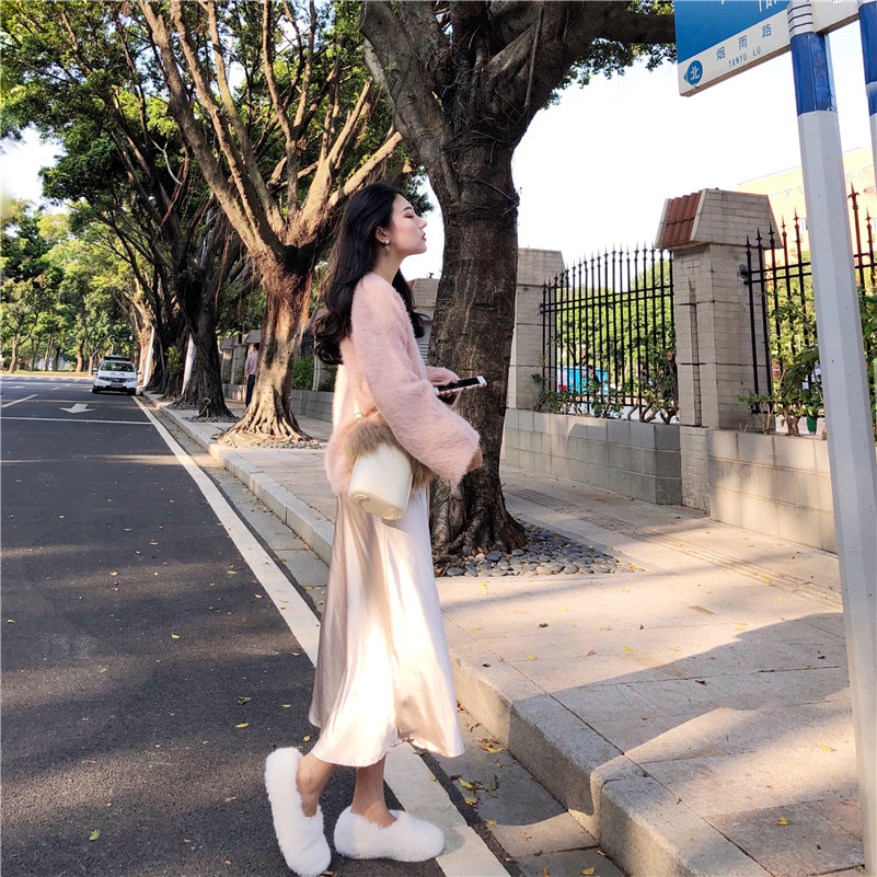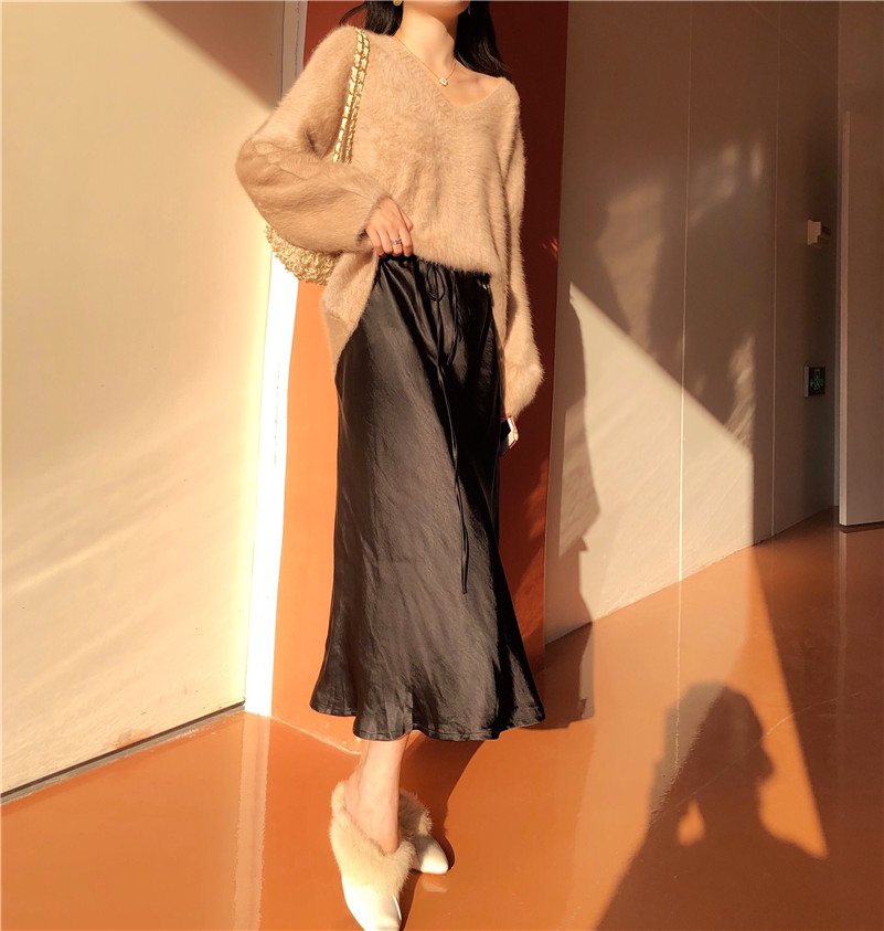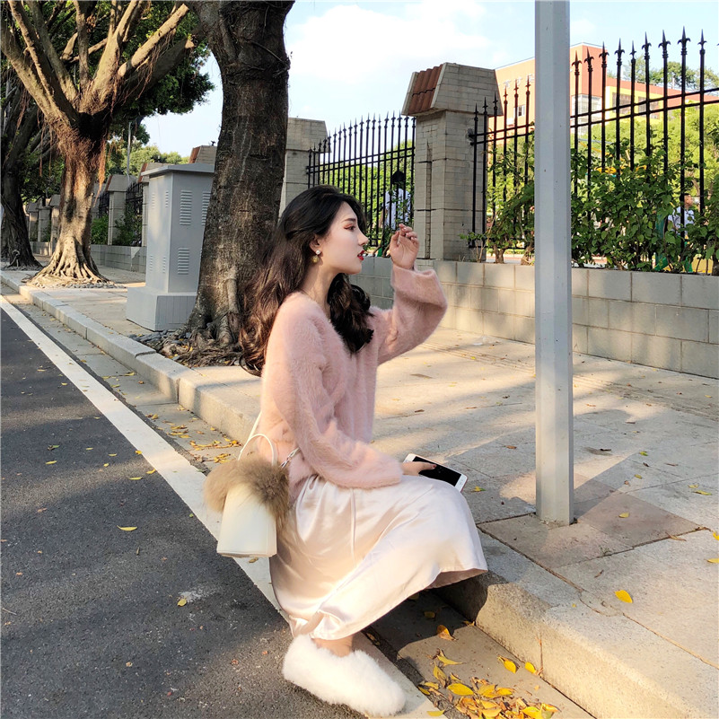 秋裝新款韓版氣質百搭V領毛衣緞面優雅中長款半身裙女時尚套裝潮