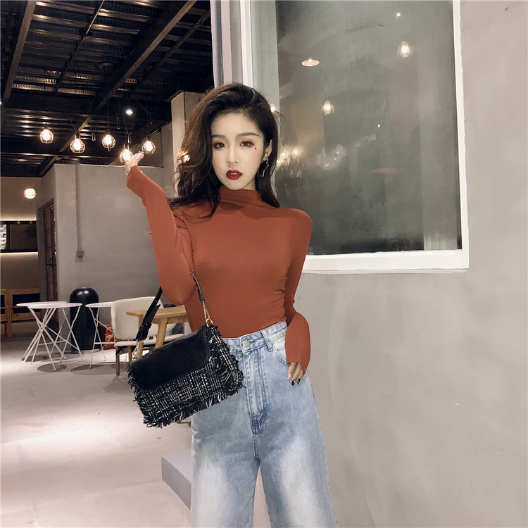 2018秋裝新款上衣女復古溫柔半高領貼身顯瘦百搭外穿打底衫T恤潮