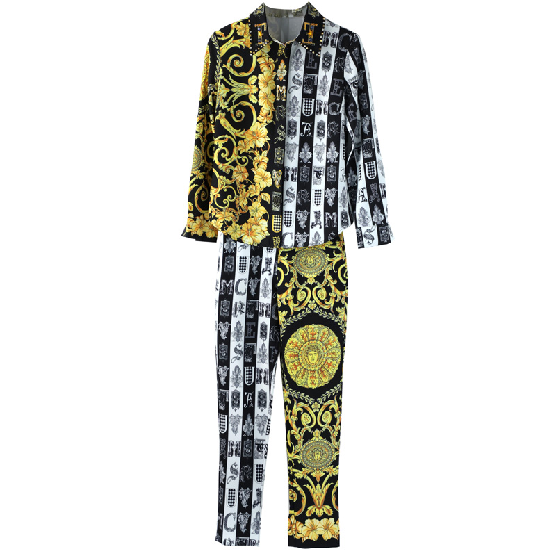 2018秋季套裝長袖印花襯衫高腰修身九分小腳褲時髦時尚兩件套女潮