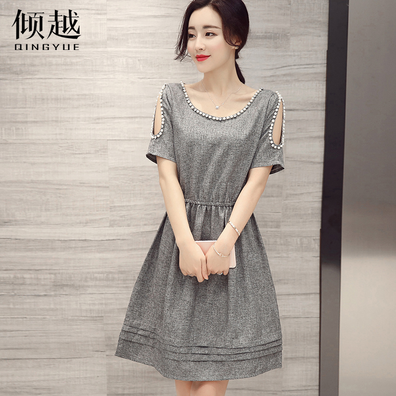 傾越2017夏季女裝收腰圓領短袖露肩連衣裙修身顯瘦簡約甜美裙子潮