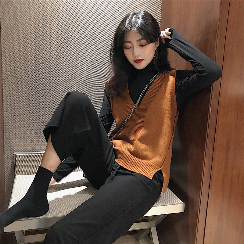 秋冬季寬松毛衣女2018新款針織馬甲背心女套頭高領打底衫闊腿褲潮