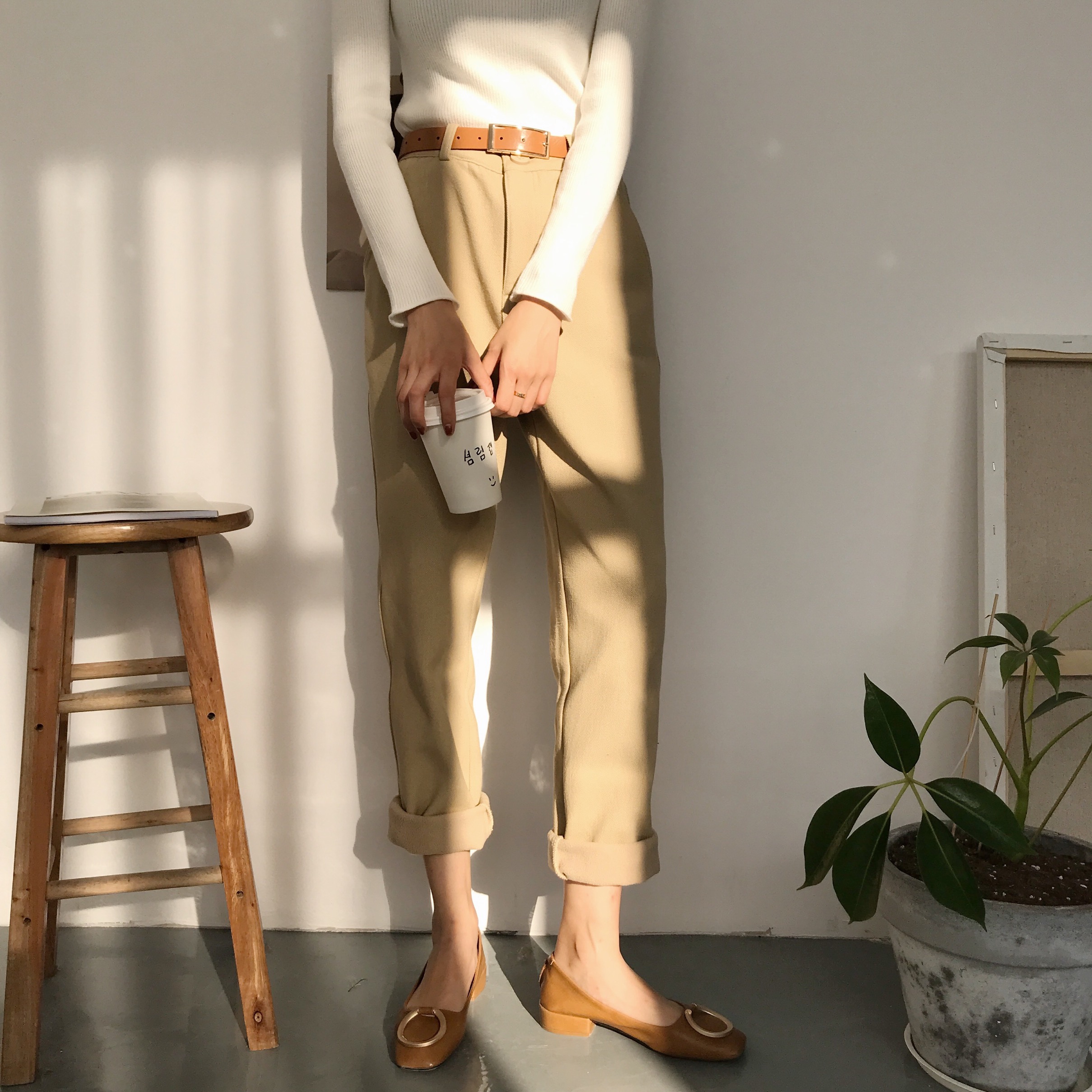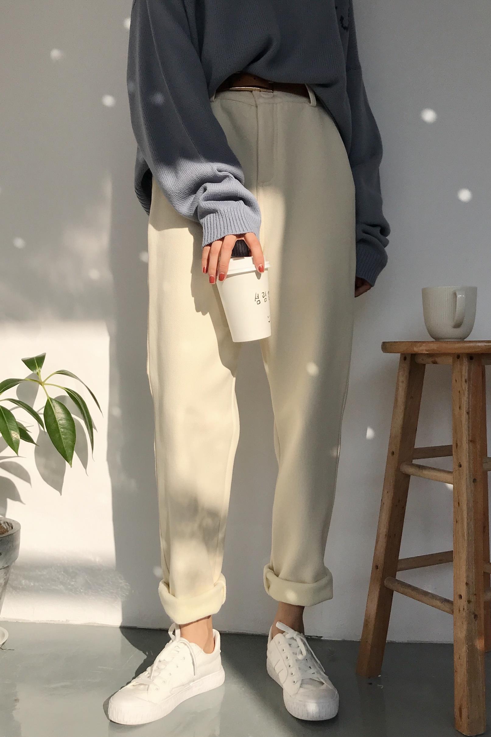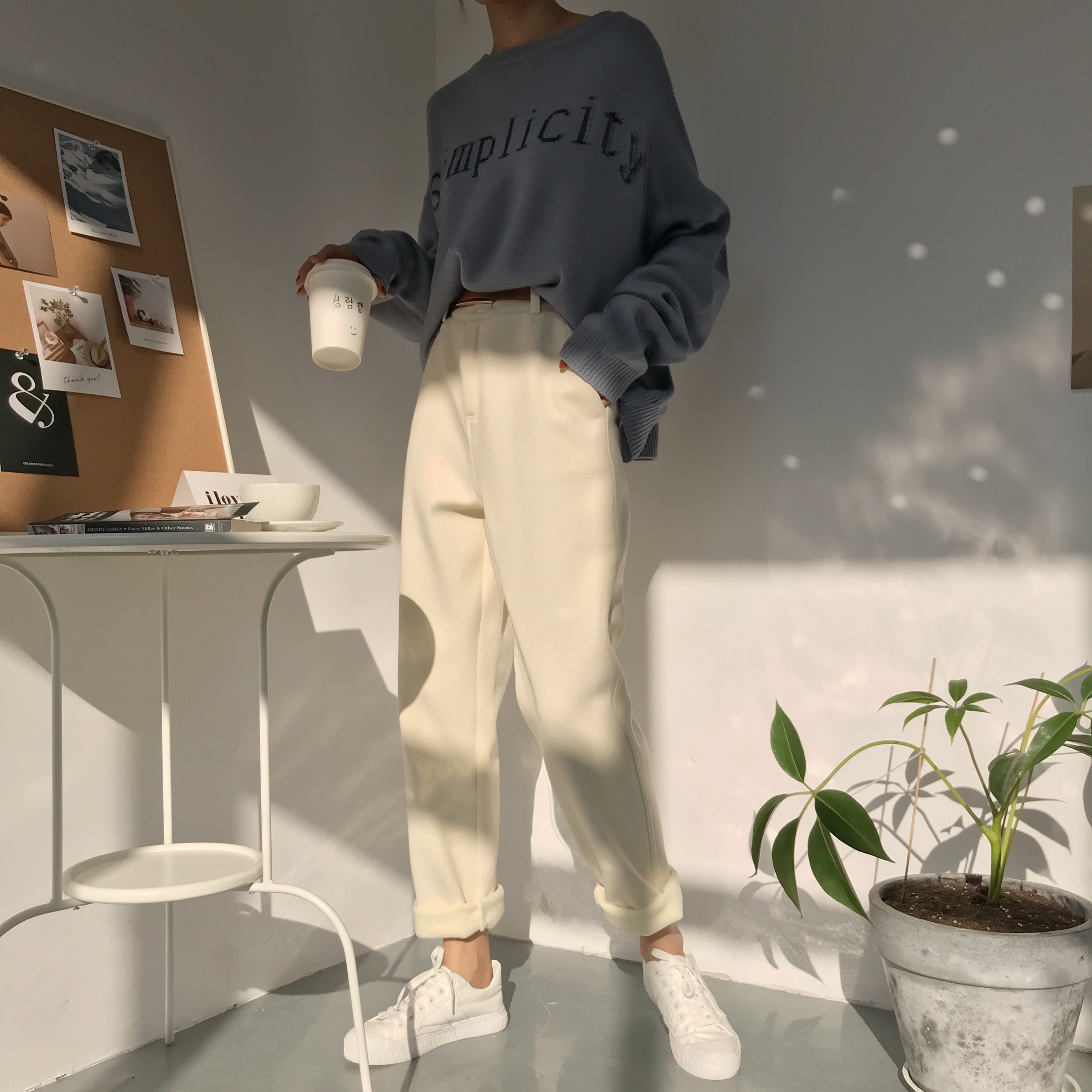 / 韓風chic秋冬季新款簡約純色顯瘦高腰加絨保暖休閑長褲女配皮帶潮
