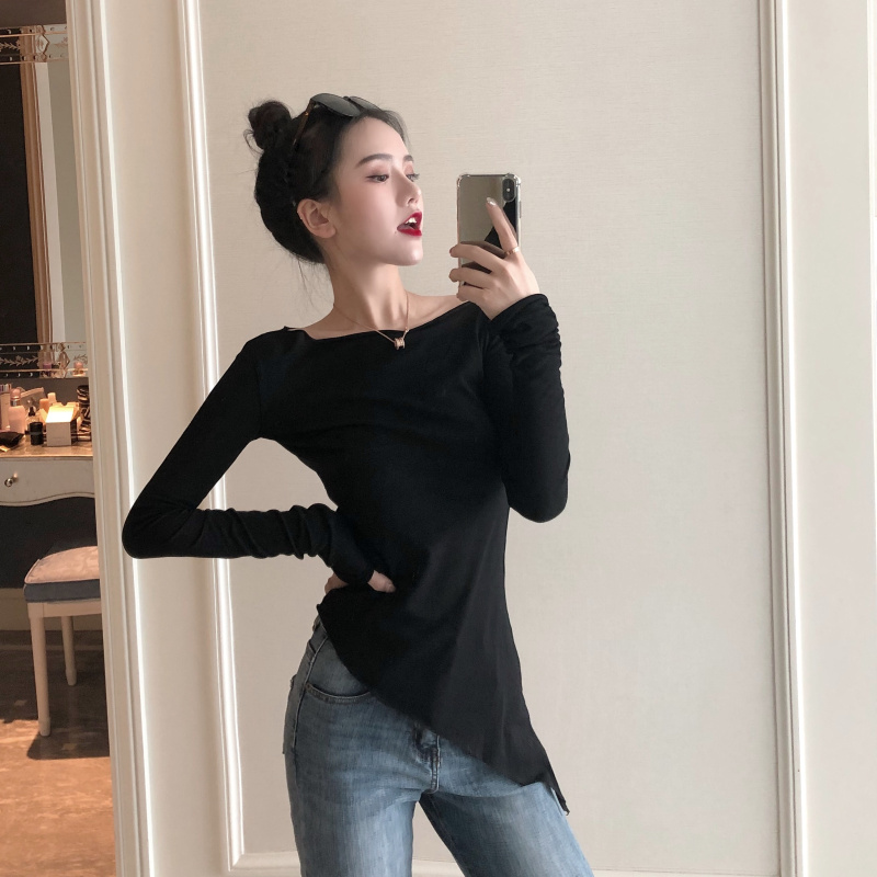 早秋2018新款韓版上衣女斜邊不規則長袖露肩顯瘦純色修身學生T恤