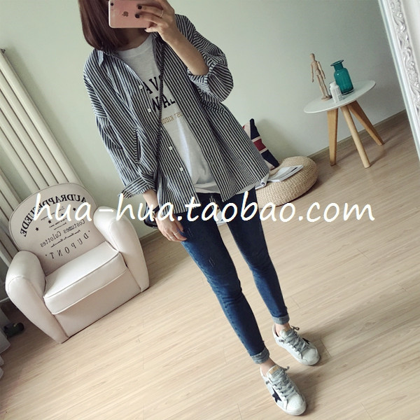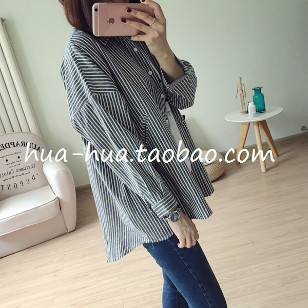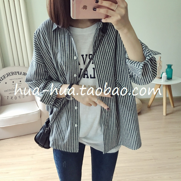 秋裝女2018新款韓版女裝豎條紋寬松長袖防曬襯衫百搭學生薄款外套