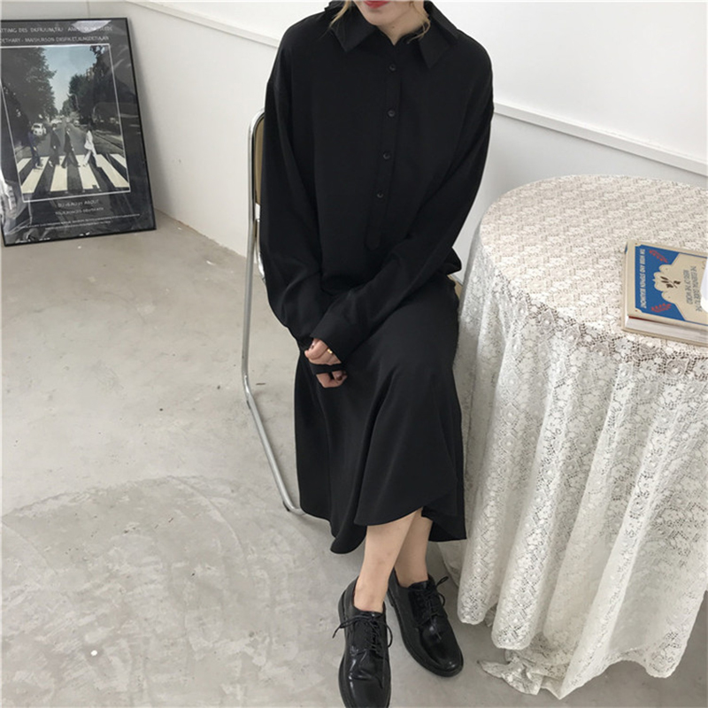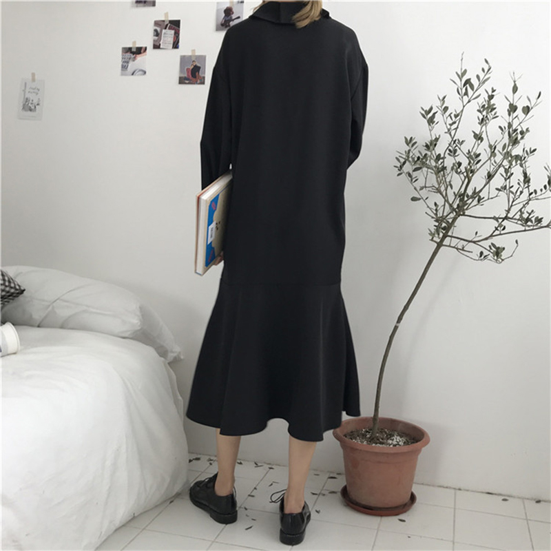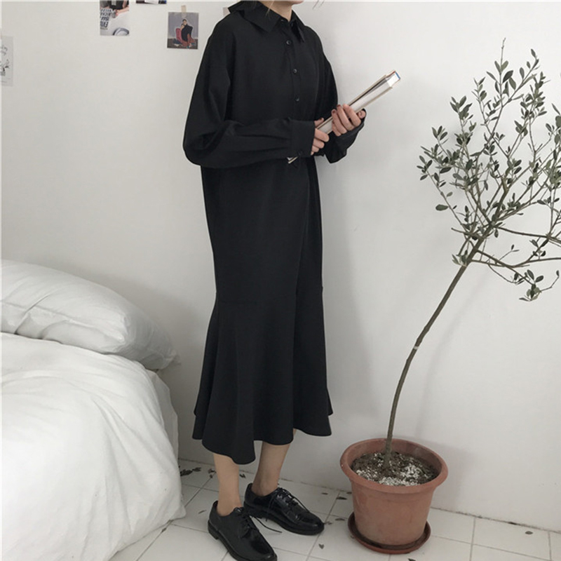 連衣裙秋裝2018新款女 長袖襯衫裙 寬松秋季全身裙 小黑長裙魚尾