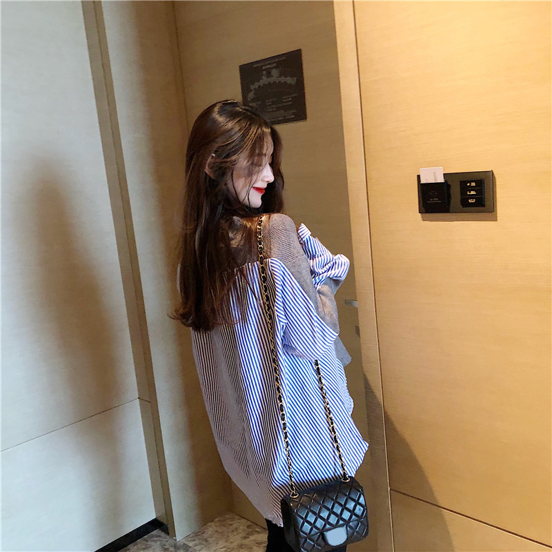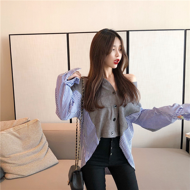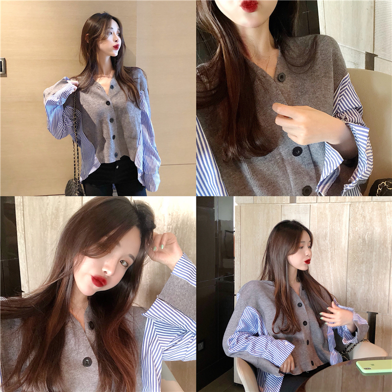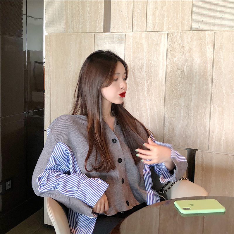 / 韓國條紋拼接針織開衫設計感時尚chic百搭女學生外套假兩件上衣潮