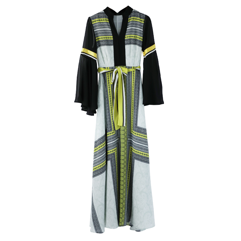 / 名媛氣質溫柔裙超仙收腰顯瘦喇叭袖復古印花長袖中長款高腰連衣裙