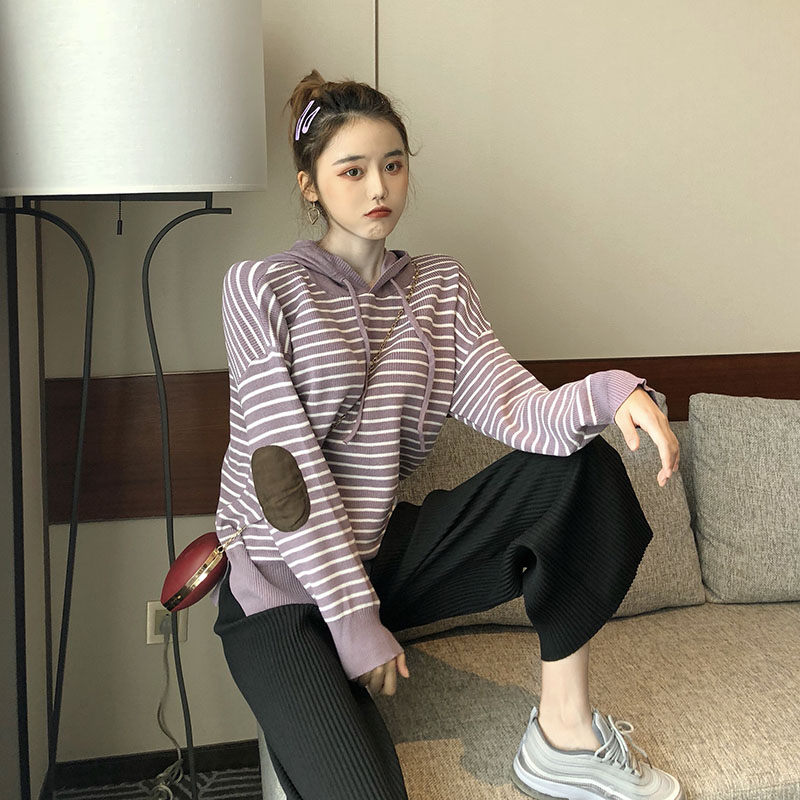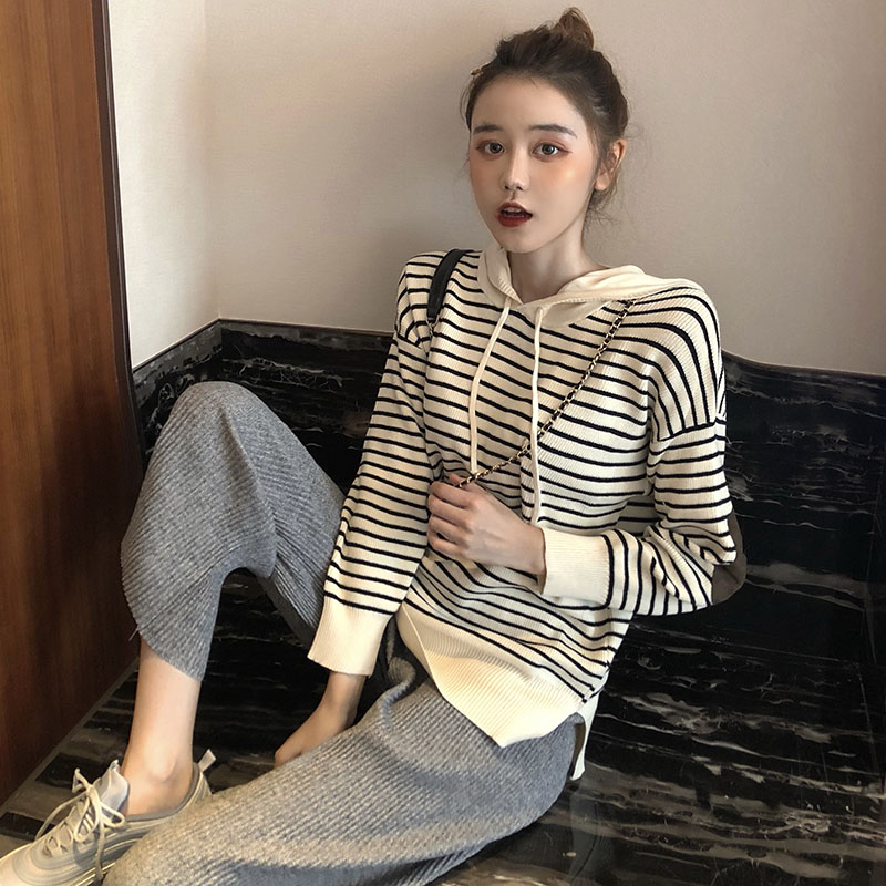 秋裝女2018新款軟糯連帽條紋毛衣女+慵懶風舒適闊腿褲(加厚版)