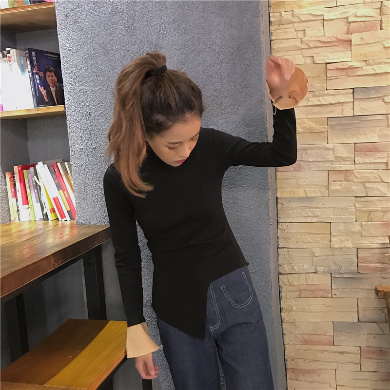 韓國東大門秋冬chic高領百搭荷葉袖套頭純色修身打底衫T恤女