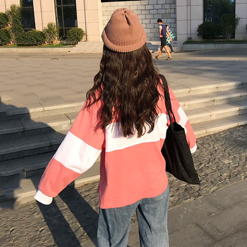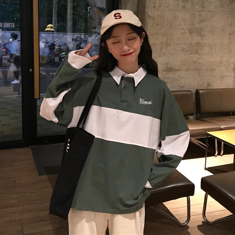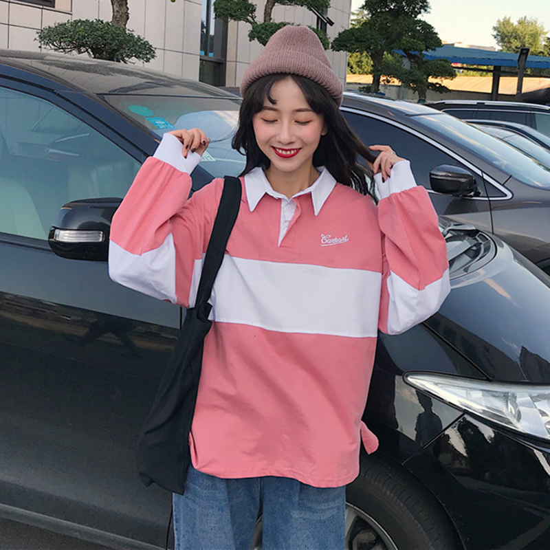 / 時尚拼色字母刺繡POLO衫秋裝女2018新款寬松長袖T恤學生休閑上衣