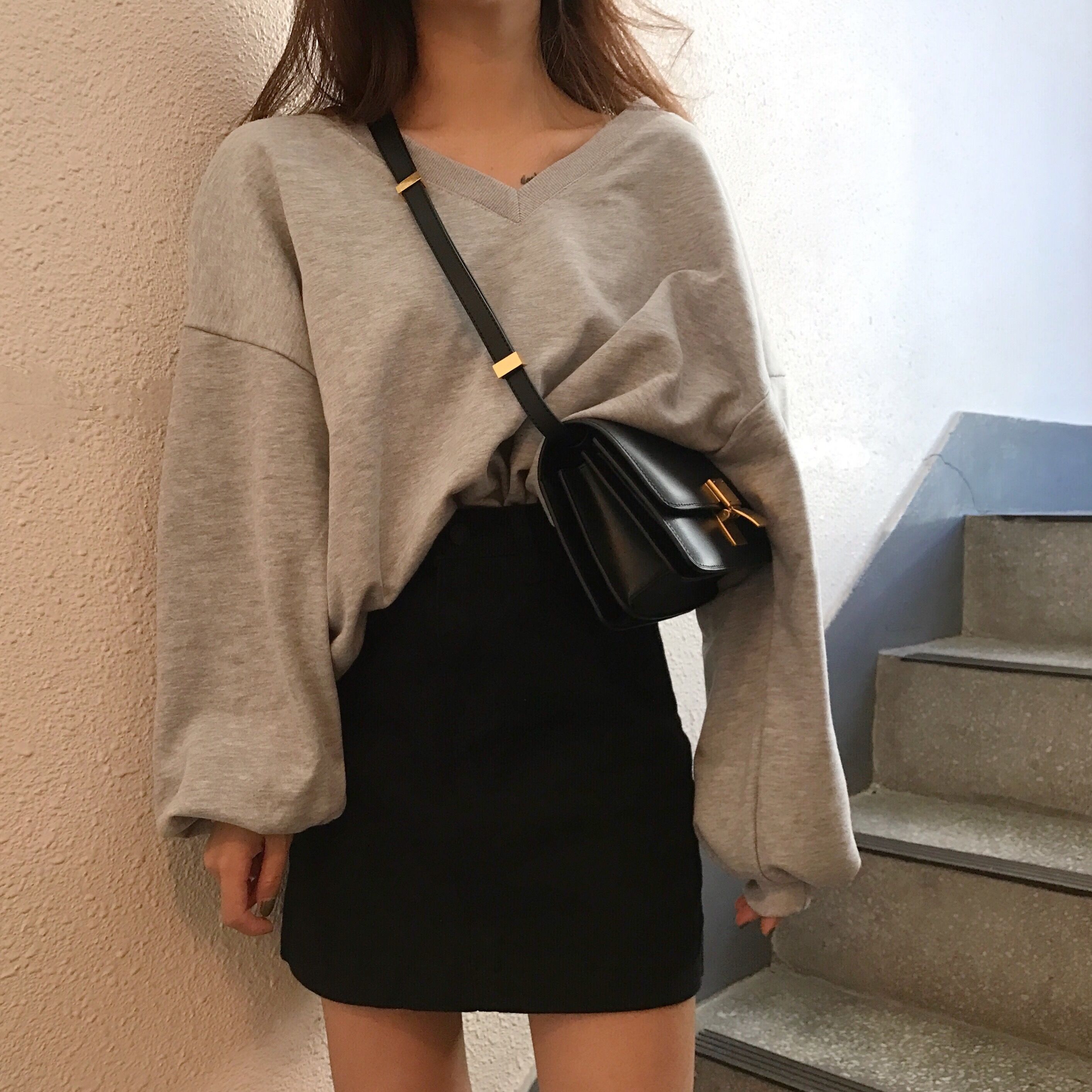 / 早秋衛衣2018新款女長袖韓版簡約主義氣質寬松V領漏肩蝙蝠袖上衣