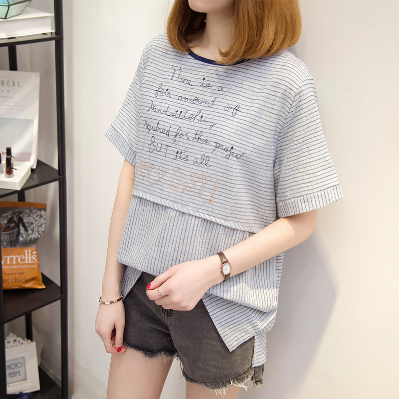 / 夏裝新款女裝條紋t恤女上衣韓版寬松拼接短袖體恤衫字母百搭