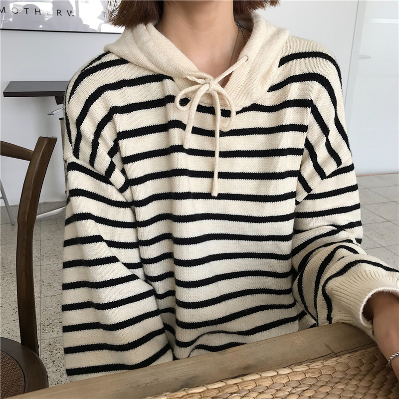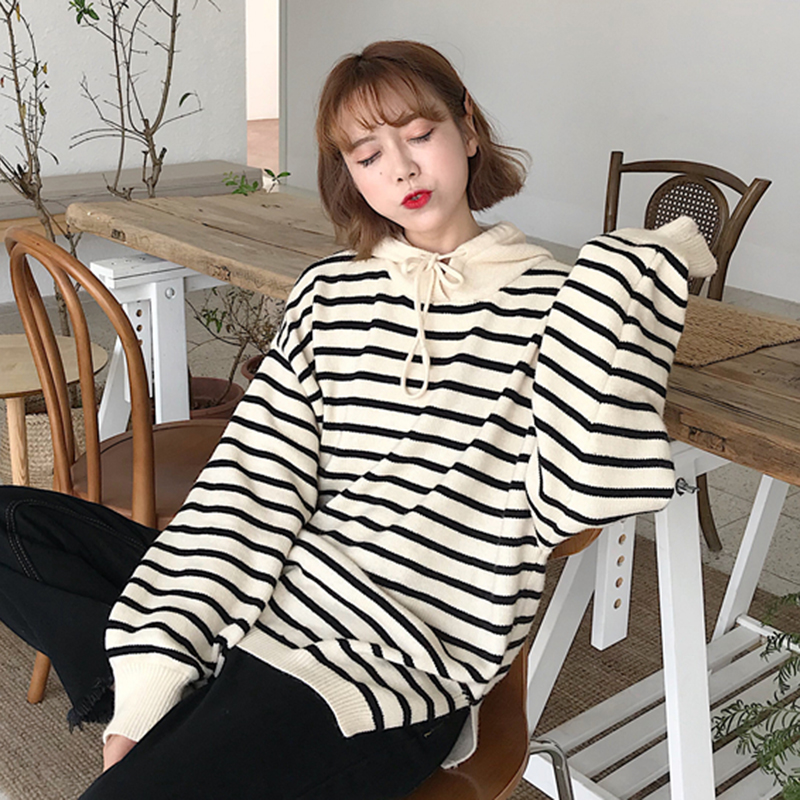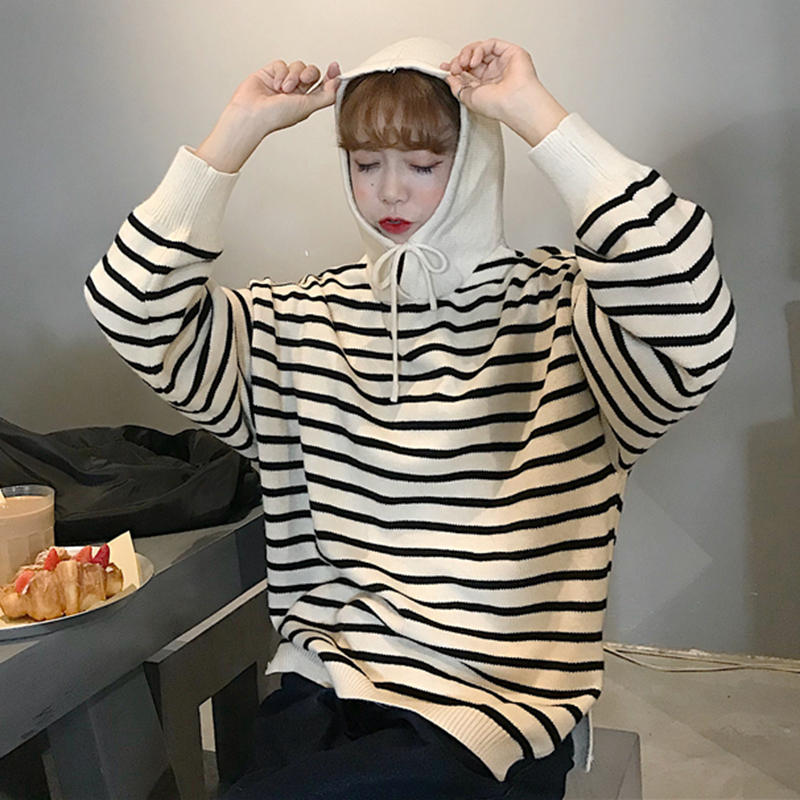 / 學院風秋裝女2018新款小清新條紋長袖針織衫毛衣側邊開叉連帽衛衣