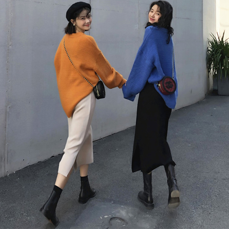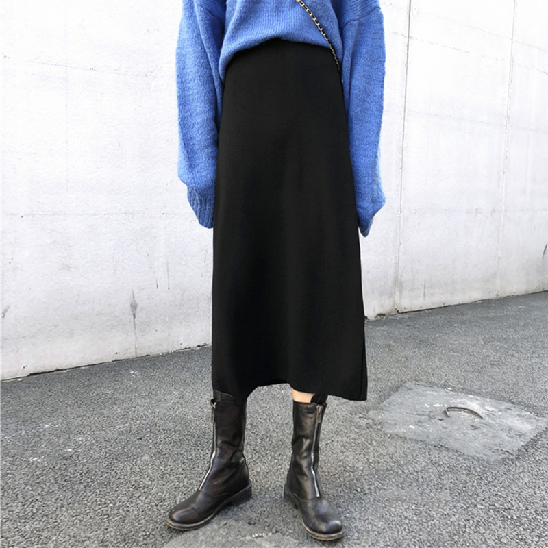 / 高腰顯瘦針織半身裙子女秋冬裝新款韓版復古風開叉學生黑色中長裙