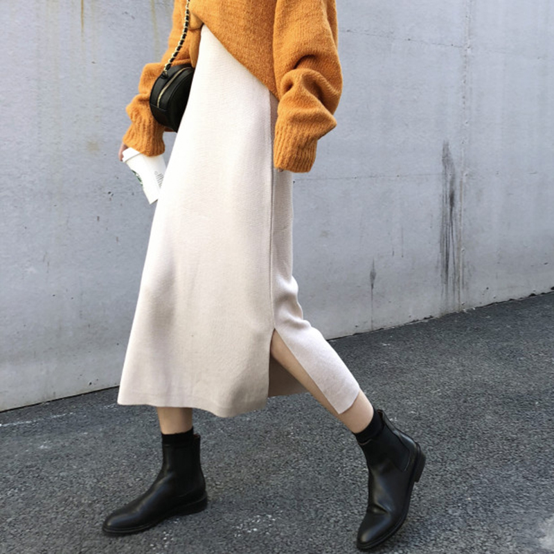 高腰顯瘦針織半身裙子女秋冬裝新款韓版復古風開叉學生黑色中長裙