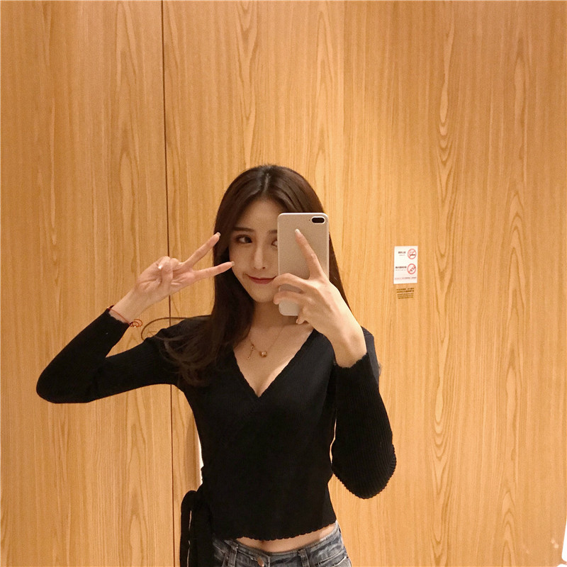/ 秋裝女2018新款系帶顯瘦顯白小女人花邊修身短款長袖針織衫上衣