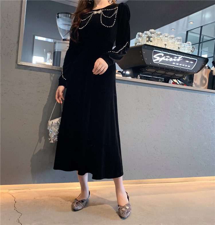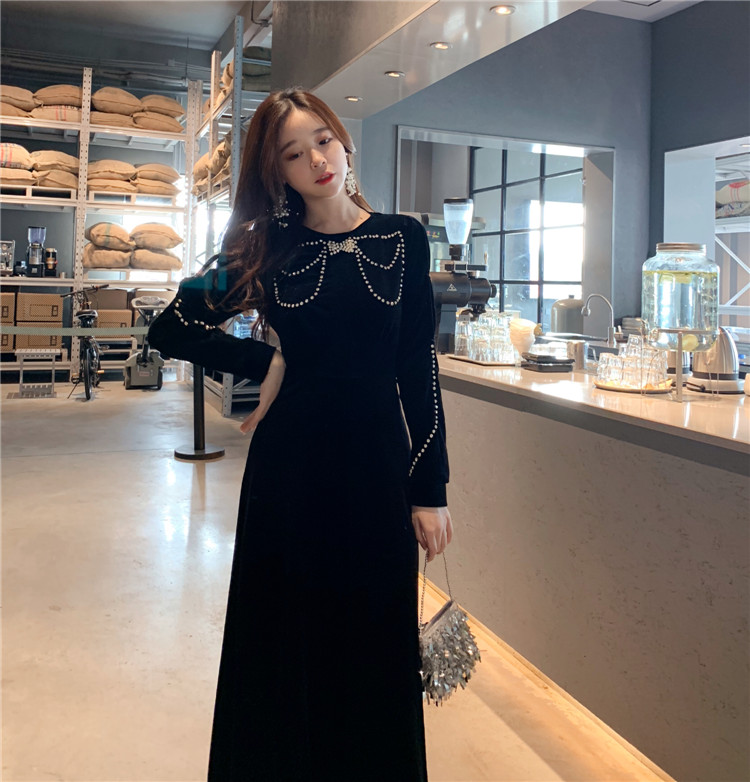 / 歡 2018秋冬內搭打底時尚小珍珠帶鉆高腰絲絨蝴蝶結圖案連衣裙