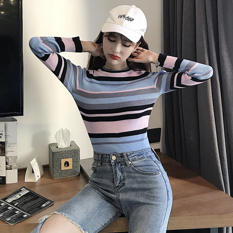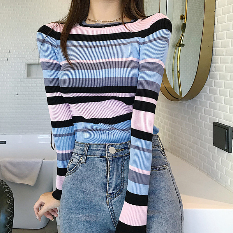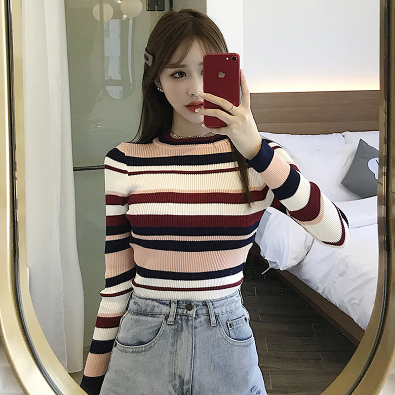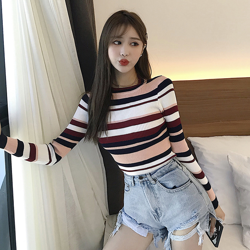 韓版chic撞色條紋長袖針織衫女秋冬裝2018新款氣質修身打底薄毛衣